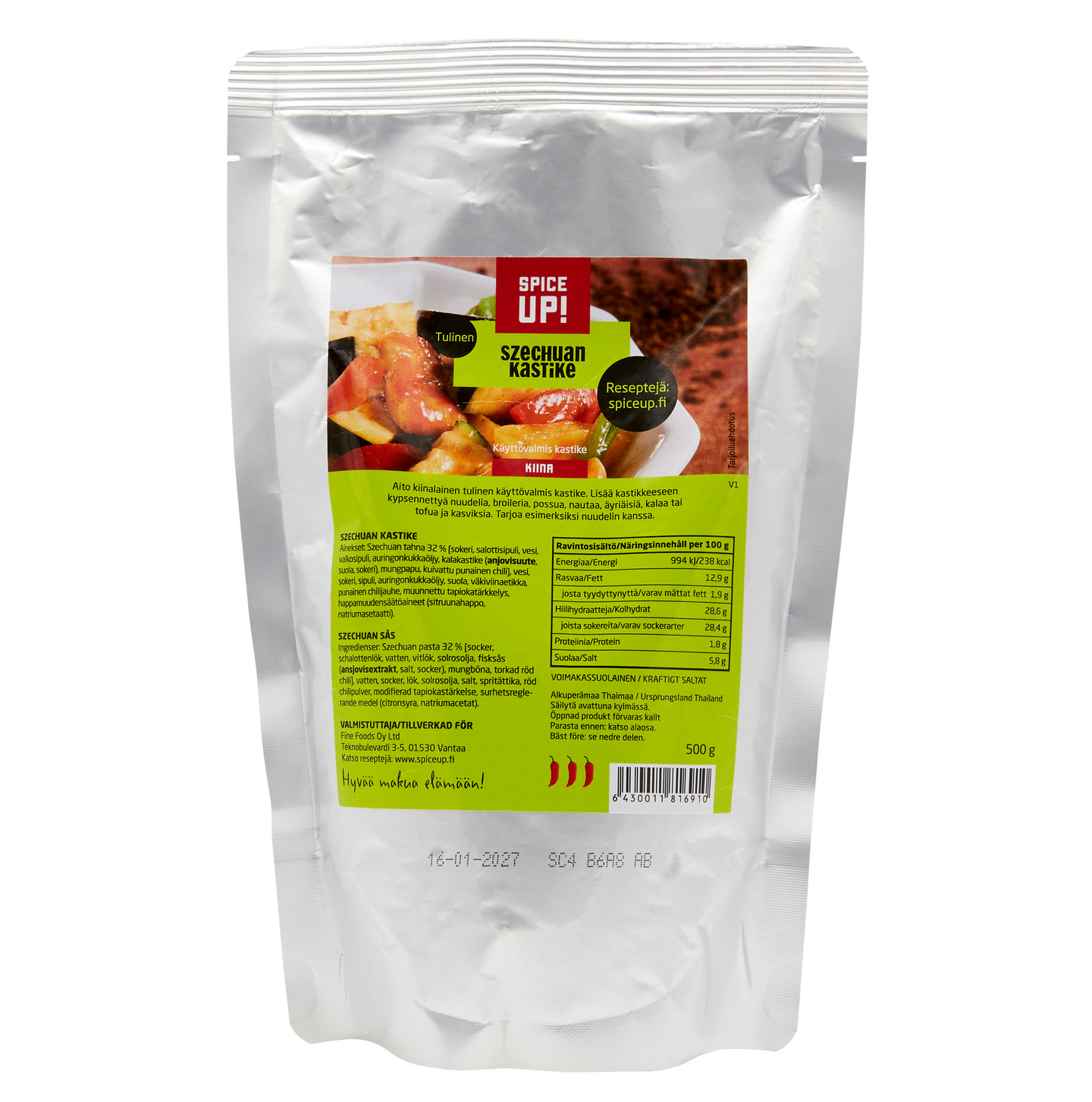 Spice Up! Szechuan kastike on aito kiinalainen käyttövalmis erittäin tulinen kastike, esimerkiksi wokkiruokiin. Lisää kastikkeeseen 1000 g broileria, possua, nautaa, äyriäisiä, kalaa tai tofua ja 1500 g kasviksia (esim. wokkivihanneksia). Kiinalainen tapa on tarjota kastiketta nuudelin tai riisin kanssa. Käyttövalmiit Spice Up! kastikkeet on pakattu käytännöllisiin 500 g pusseihin, joista riittää kymmenen henkilön kerta-annokseen. Lisäksi tarvitset vain lihaa ja/tai kasviksia.