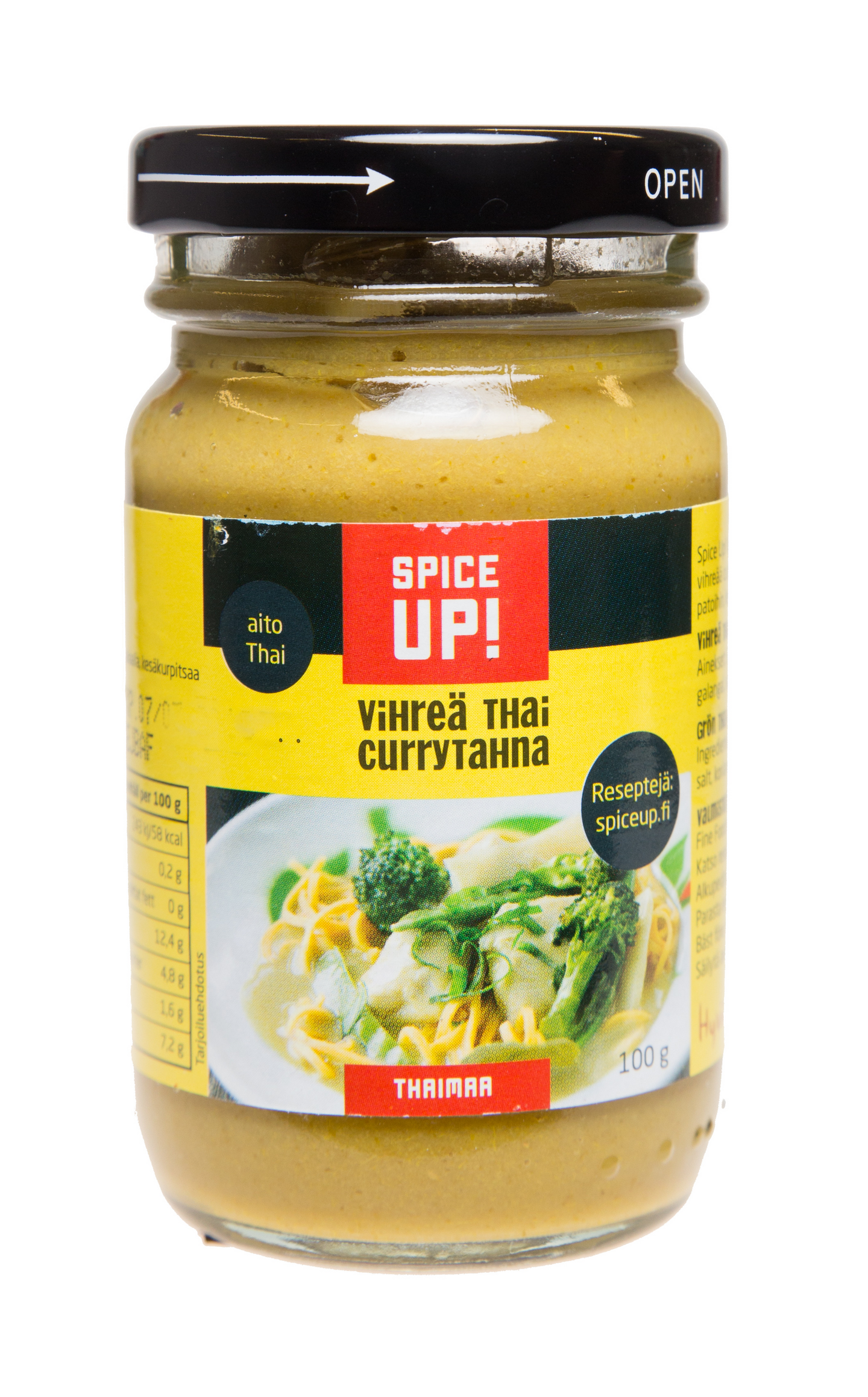 VegaaninenSpice Up! Vihreä Thai Currytahna on valmistettu vihreistä chileistä, tuoreista yrteistä ja maustekasveista. Spice Up! Vihreä Thai Currytahnalla valmistat aidonmakuista thaimaalaista vihreää currya. Kokeile myös muihin liha-, kala- ja kasvisruokiin, esimerkiksi patoihin, keittoihin, murekkeisiin, marinadeihin ja kuorrutuksiin. Tahna on hyvin riittoisaa, annosta kohti tarvitset vain 1-2 rkl tahnaa. Avattu purkki säilyy jääkaapissa useita viikkoja. Tahna on keskitulinen.