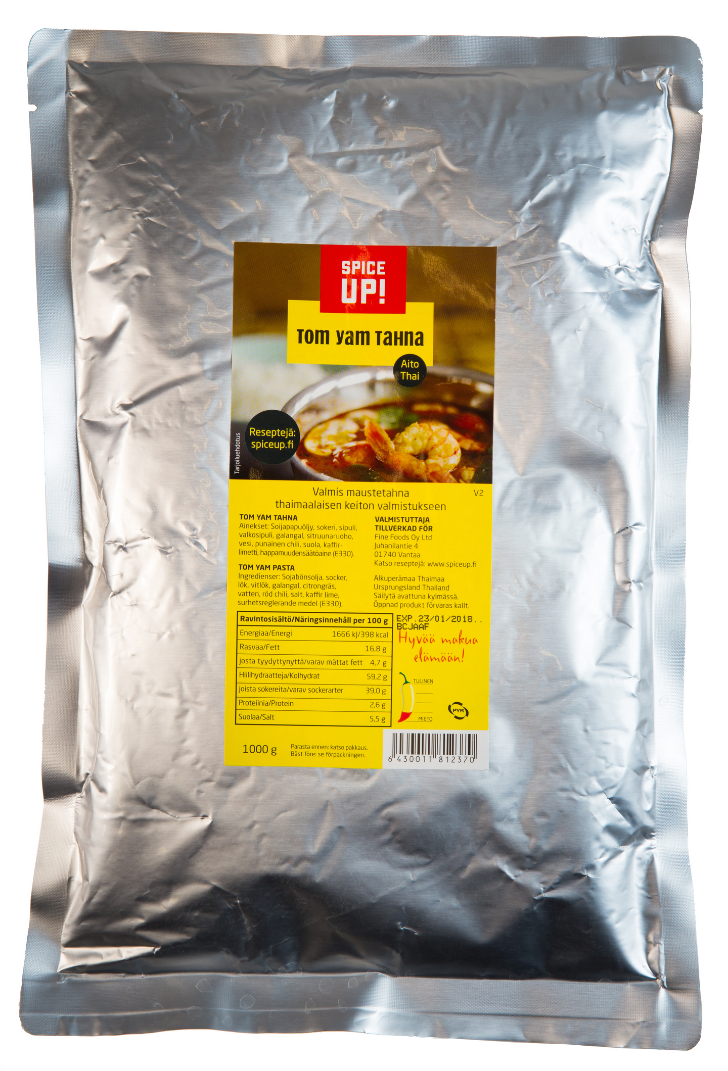 VegaaninenSpice Up! Tom Yam tahnalla valmistat helposti aidonmakuista thaimaalaista Tom Yam keittoa. Tom Yam -keitto on yksi suosituimmista thaimaalaisista ruoista. Maukas keitto tuo ruokapöytiimme pilkahduksen Thaimaan aurinkoa ja monipuolista makumaailmaa. Vaihtoehtoisesti voit valmistaa tom yam tahnasta täyteläistä Tom Kha -keittoa korvaamalla osan nesteestä kookosmaidolla tai -kermalla. Kokeile tahnaa myös muihin keittoihin, kastikkeisiin, marinadeihin, patoihin ja murekkeisiin. Mieto tahna sopii erittäin hyvin maustamaan erilaisia kala- ja äyriäisruokia.