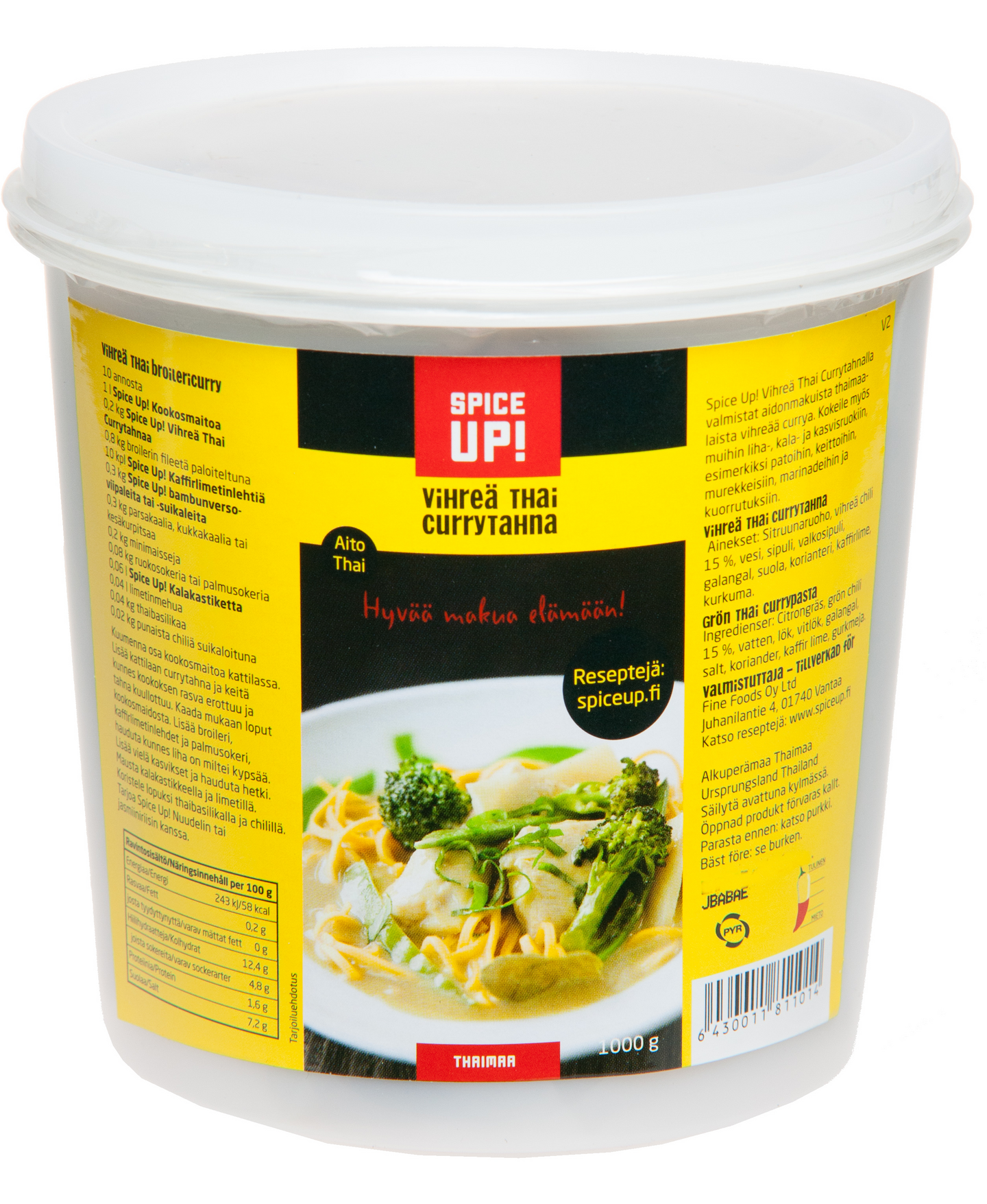 VegaaninenSpice Up! Vihreä Thai Currytahna on valmistettu vihreistä chileistä, tuoreista yrteistä ja maustekasveista. Spice Up! Vihreä Thai Currytahnalla valmistat aidonmakuista thaimaalaista vihreää currya. Kokeile myös muihin liha-, kala- ja kasvisruokiin, esimerkiksi patoihin, keittoihin, murekkeisiin, marinadeihin ja kuorrutuksiin. Tahna on keskitulinen.
