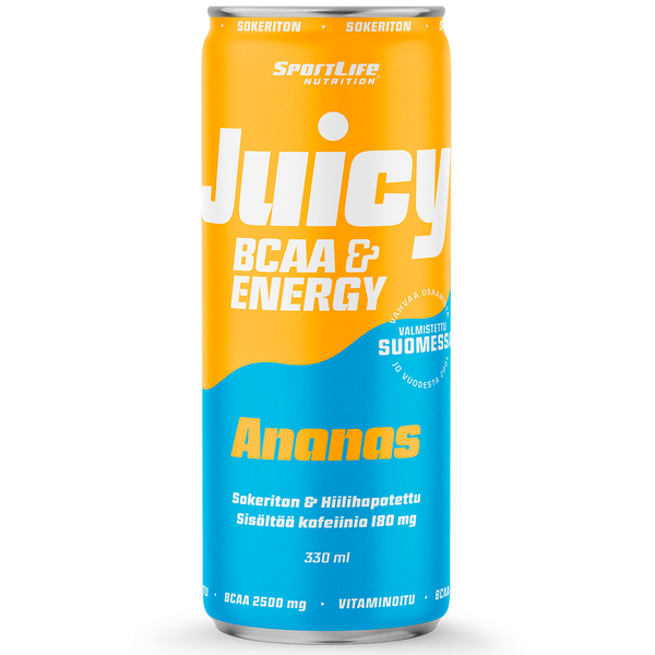 SportLife Nutrition Juicy BCAA on Suomessa valmistettu maukas ja sokeriton kehoa vahvistava virkistysjuoma. Sisältää 2500mg BCAA-aminohappoja, 180mg kofeiinia, vitamiineja ja vihreätee uutetta. Sopii nautittavaksi niin arjessa, juhlassa kuin liikunnan yhteydessäkin.