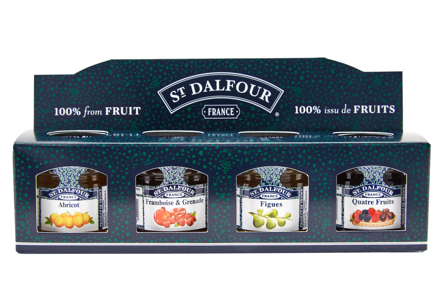 St. Dalfour hillolajitelmassa löydät neljä herkullista makua. St. Dalfour minihillot maistuvat juustojen kanssa ja aamiaisella sekä brunssilla esimerkiksi croissanttien ja skonssien kera. Kauniisti pakattu hillolajitelma on myös hyvä lahjaidea.