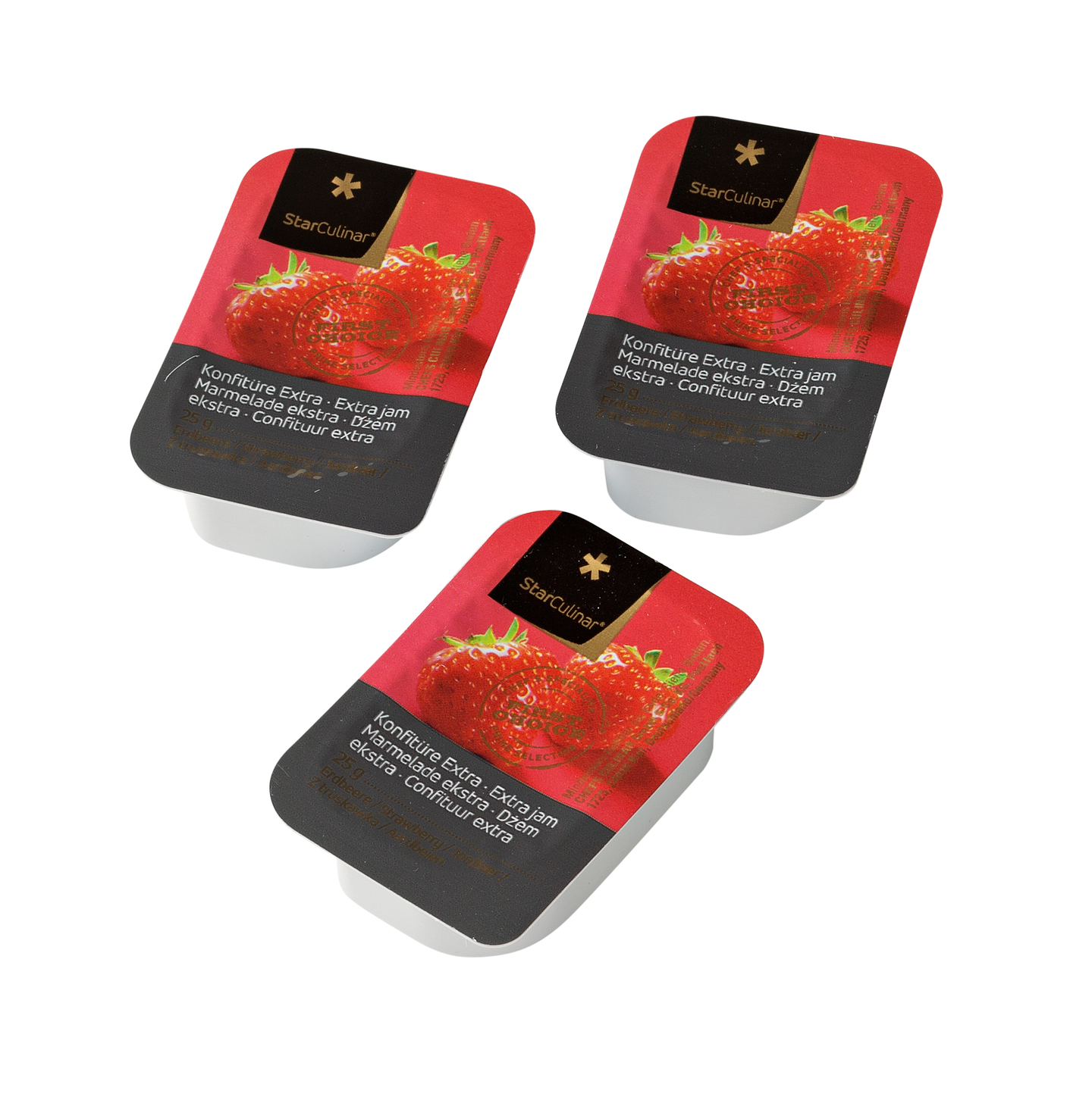 Mansikka-annoshillo tuo annosteluun nopeutta ja tasalaatuisuutta. 120 valmista 25 gramman yksittäispakattua annosta helpottaa aamiaisbuffetin tai kahvilan tarjoilua.