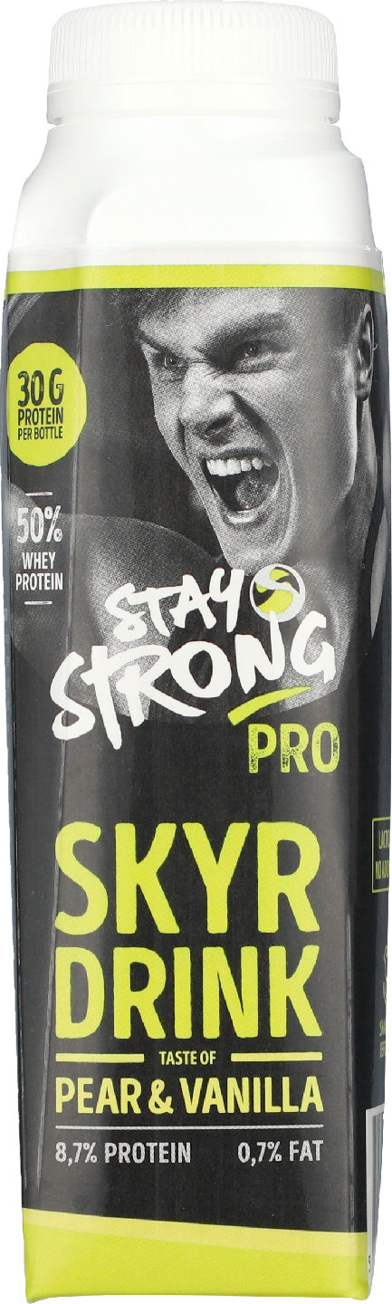 LaktoositonStay Strong PRO Skyr-juoma on sinulle, joka haluat proteiinipitoisia juomia. PRO Skyr -juoma sisältää 30 g proteiineja per pullo (8,7 %). Tässä maussa on päärynäinen ja vaniljan maku.