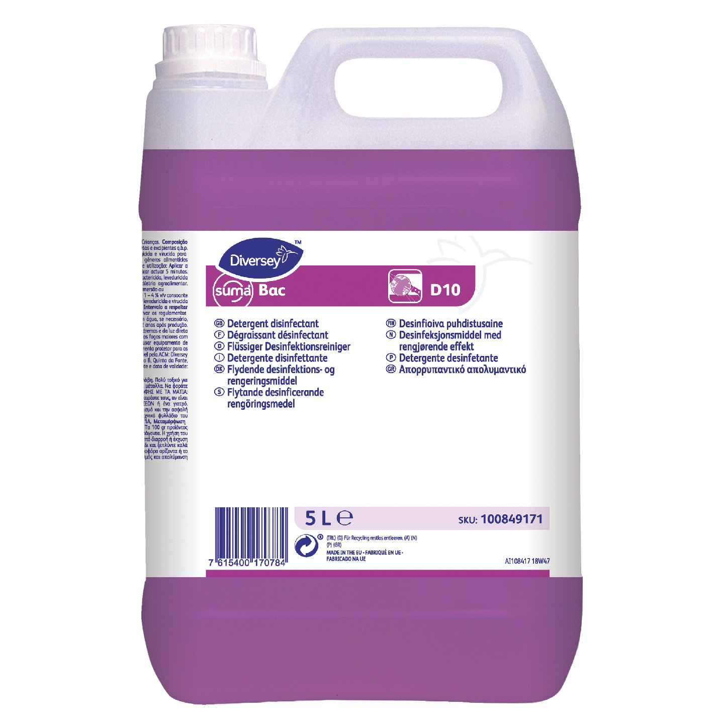 Suma Bac D10 on tehokas desinfioiva puhdistusaine ruuanvalmistustilojen kaikkien pintojen yhdistettyyn pesuun ja desinfiointiin. Ainoastaan ammattikäyttöön.