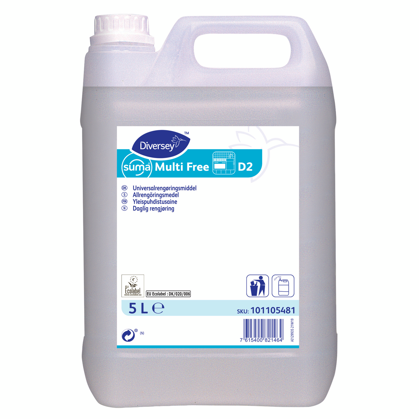 Suma Multi free D2 on tehokas yleispuhdistusaine ruuanvalmistustilojen kovien pintojen, kuten lattioiden, seinien, ovien, kattojen ja laitteiden, puhdistukseen. Ympäristömerkitty (Joutsenmerkki). Ainoastaan ammattikäyttöön.