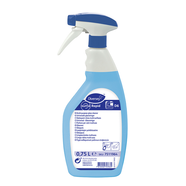 Suma Rapid D6 on käyttövalmis puhdistusaine lasipinnoille ja muille koville, vettä sietäville pinnoille. Puhdistusliuos levitetään pinnoille sumutinpullolla. Ainoastaan ammattikäyttöön.