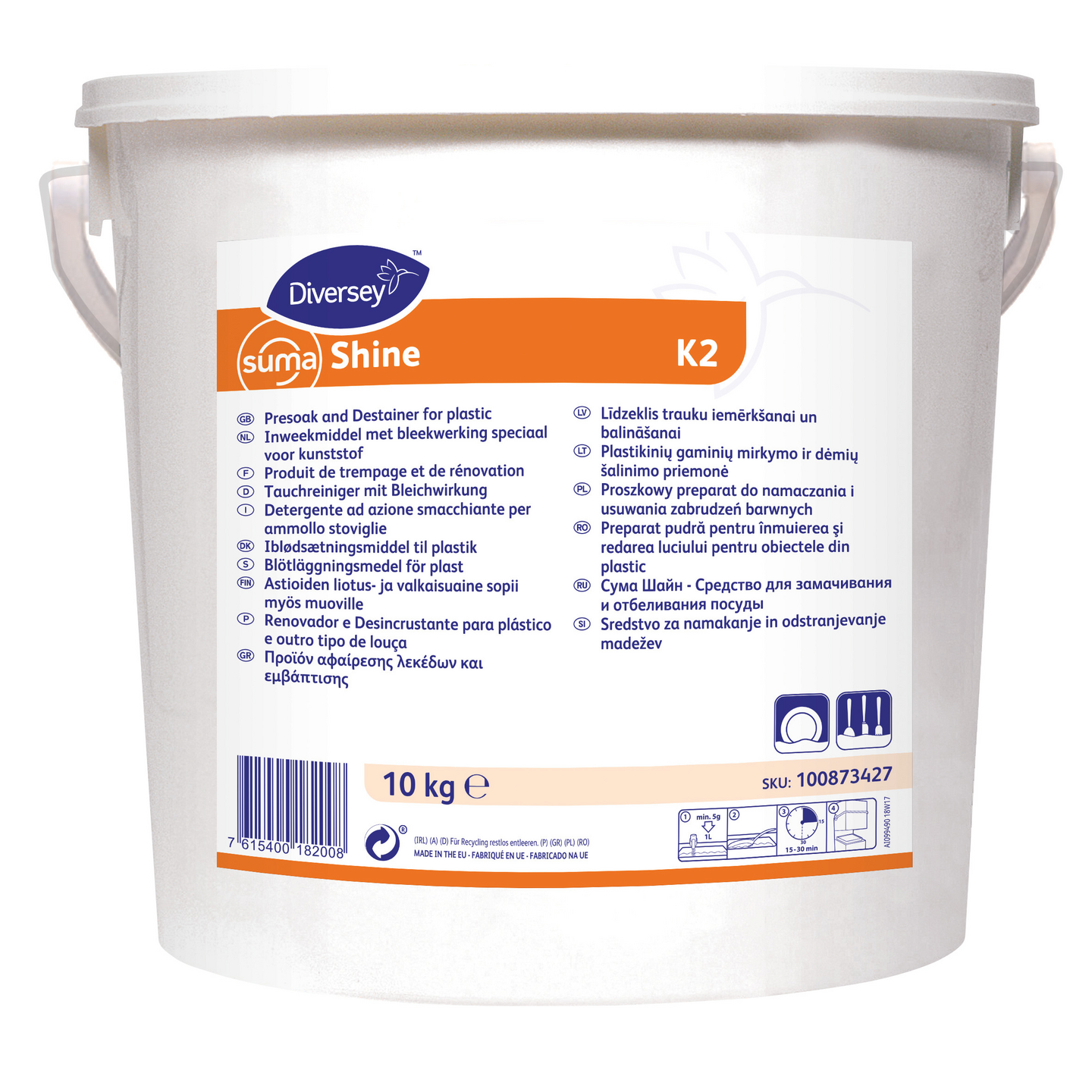 Suma Shine K2 on jauhemainen liotus- ja valkaisuaine kiinni kuivuneen lian sekä vaikeiden tahrojen liottamalla tapahtuvaan irrottamiseen astioista ja ruokailuvälineistä. Soveltuu myös kahvilaitteiden puhdistukseen. Ainoastaan ammattikäyttöön.