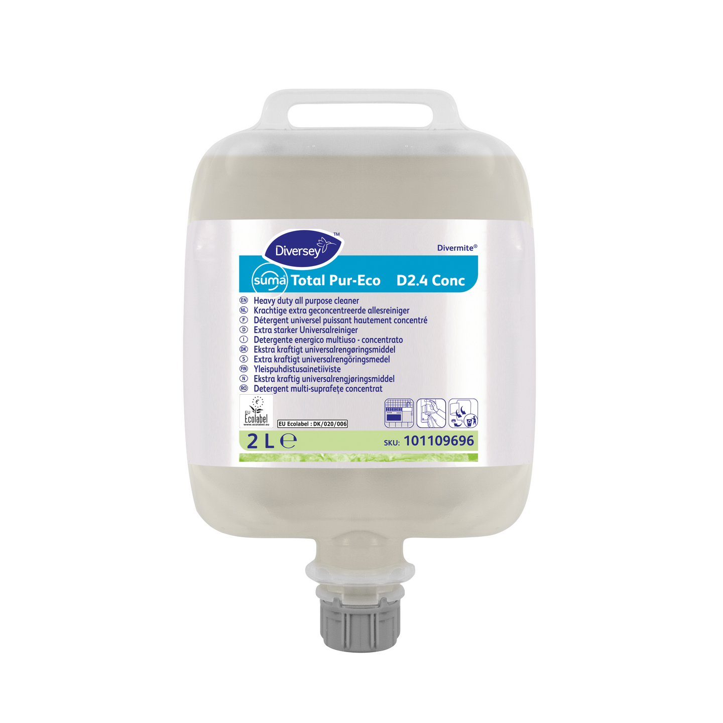 Suma Total Pur-Eco D2.4 conc on tiivistetty, yleispuhdistusaine ruuanvalmistustilojen kovien pintojen, kuten lattioiden, seinien, kattojen ja laitteiden, puhdistukseen. Ainoastaan ammattikäyttöön.