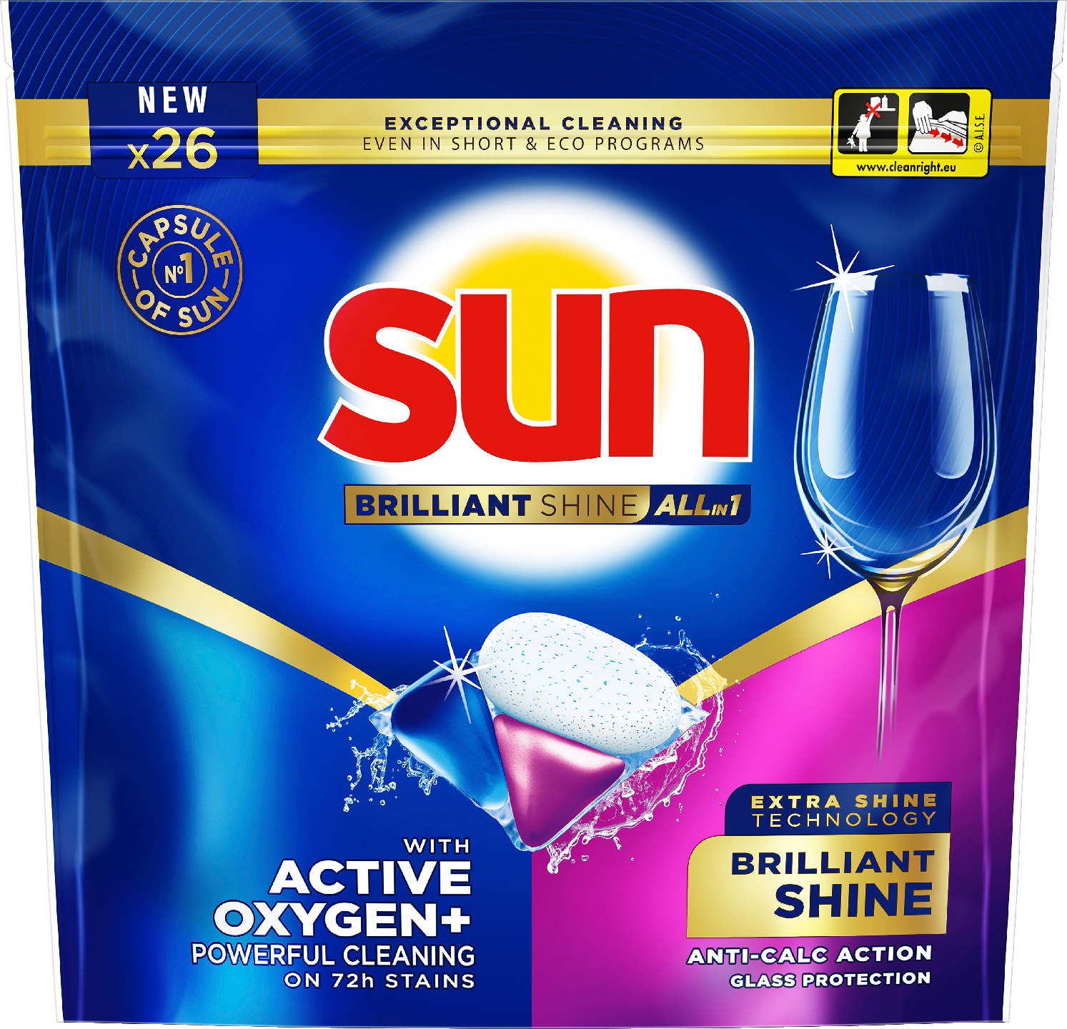 Säihkyvää kirkkautta pesusta pesuun. Sun Brilliant Shine All in one on optimoiduin pesutuotteemme. Konetiskitabletti All-in-1 tarjoaa poikkeuksellista pesutehoa, vaikka siinä on käytetty vähemmän kemikaaleja! Nestemäisen ja jauhemaisen koostumuksen parhaat puolet yhdistyvät tässä kompaktissa 3-tehoisessa kapselissa, joka syväpuhdistaa, antaa astioille säihkyvää kirkkautta ja raikkaan tuoksun.