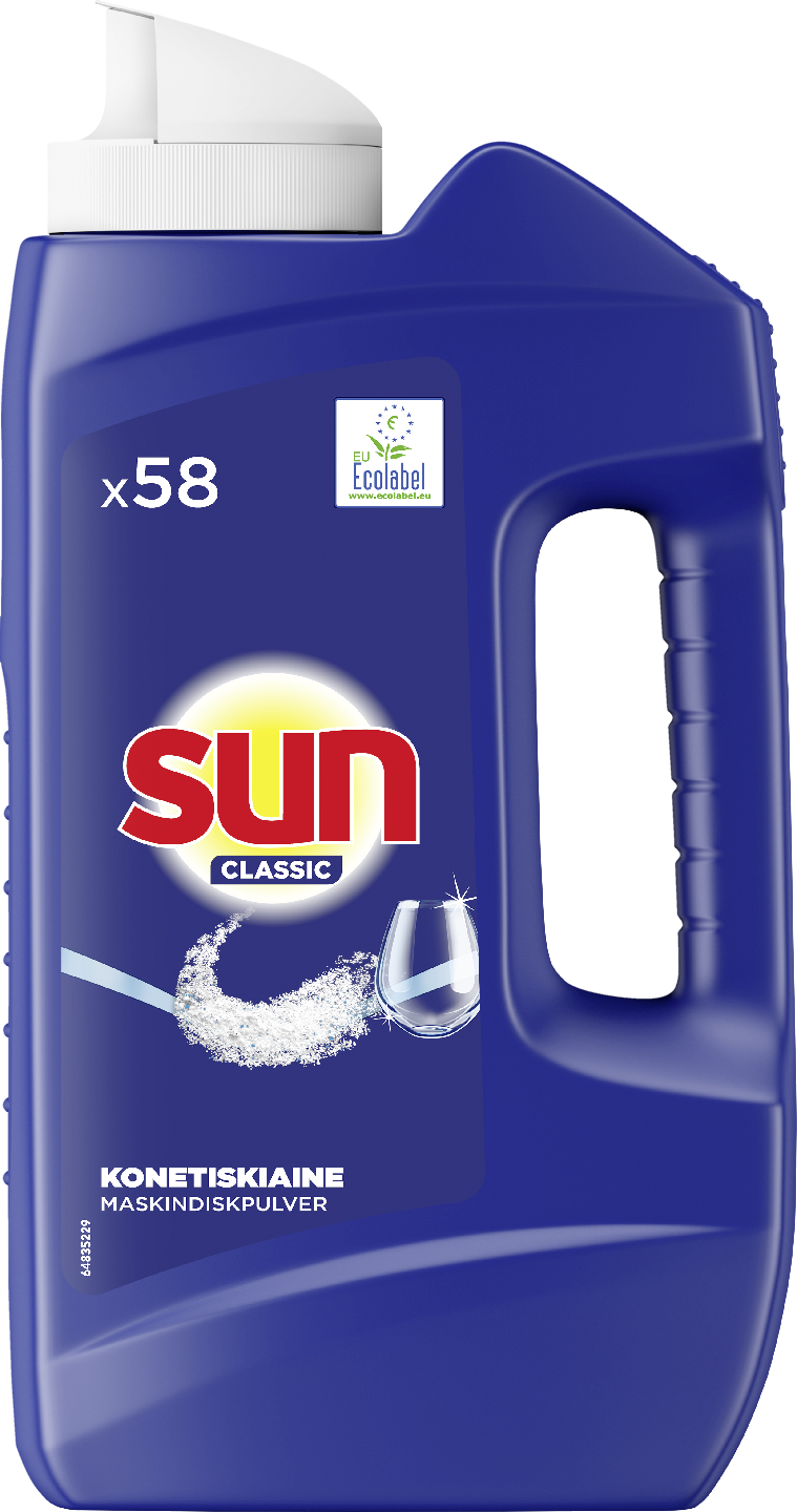 Sun Classic on konetiskijauhe, johon voit luottaa, kun haluat loistavan puhtaita astioita. Sun Classicissa on nyt uusi, entistä tiiviimpi koostumus, jonka ansiosta saat jopa 93 % enemmän pesukertoja pakkausta kohti verrattuna aikaisempaan koostumukseen. Sun Classic -konetiskiaine pesee astiat puhtaaksi jo 50 °C:ssa ja on tehokas pikapesussa. Pesuaineella on EU-Ecolabel – ympäristömerkki. EU-ympäristömerkki kertoo puolueettomasti tuotteen ja palvelun ympäristöystävällisyydestä – tuotteen turvallisuutta ja laadukkuutta unohtamatta. Se ohjaa kuluttajia ja yrityksiä vastuulliseen, ympäristön paremmin huomioivaan kuluttamiseen. Kun haluat astioillesi huippuunsa vietyä kiiltoa ja säihkettä, käytä Sun Classic -konetiskijauhetta Sun Classic -huuhtelukirkasteeseen ja Sun Classic -pesukonesuolan kanssa. Yli 50 vuoden ajan, vuodesta 1965 alkaen, Sun on kehittänyt tuotteitaan entistä paremmiksi, jotta ne toimivat moitteettomasti ja takaavat parhaan pesutuloksen myös alhaisissa pesulämpötiloissa ja lyhytohjelmissa. Näin sinä pystyt säästämään vettä ja energiaa. Innovatiivisten Sun-tuotteiden avulla pidät parempaa huolta astioista – ja myös tiskikone pysyy hyvänä! Ei siis ole sattumaa, että Sun on tuotemerkki, johon ihmiset luottavat – niin Suomessa kuin maailmalla. *verrattuna muihin Sun All-in-1 -tabletteihin. Muistathan hoitaa myös astianpesukonettasi! Kuten muihinkin vettä käyttäviin kodinkoneisiin, myös astianpesukoneeseen jää pesuainejämiä ja syntyy kalkkikertymiä. Näiden lisäksi koneeseen kertyy likaa ruoantähteiden ja rasvan mukana. Jotta astianpesukoneesi toimii jatkossakin tehokkaasti ja pesutulokset pysyvät hyvinä, tulee astianpesukone puhdistaa säännöllisesti. Jos käytät kaupasta ostettua tiskikoneen puhdistusainetta – esimerkiksi Sun astianpesukoneen puhdistusaine – noudata tarkkaan pakkauksen käyttöohjeita.