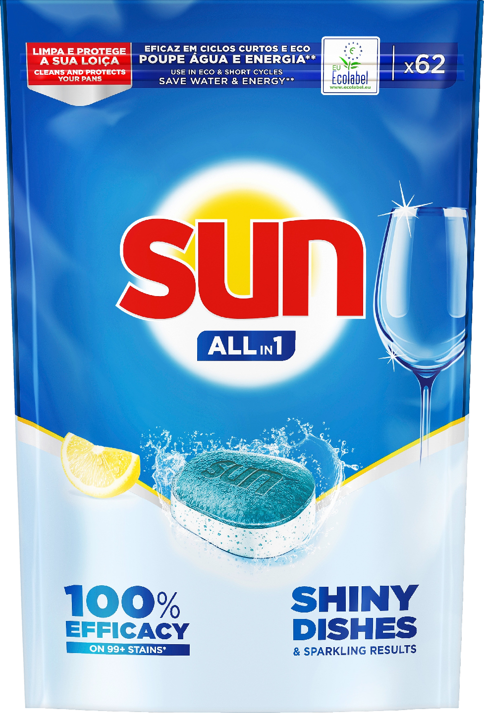 Sun All-in-1 Lemon -konetiskitabletilla on ympäristömerkki. Sun All-in-1 Lemon -konetiskitabletti on tehokas jo lyhytohjelmissa tai pikaohjelmissa ja eko-ohjelmien alhaisemmissa lämpötiloissa. Ei tarvetta huuhtelulle, mikä tarkoittaa pienempää energiankulutusta ja pienempää vedenkulutusta. Muita konetiskiaineita saatat joutua täydentämään muilla tuotteilla, Sun All-in-1 Lemon -konetiskitabletti tekee kaiken työn yhdellä tabletilla: se poistaa rasvaa ja kalkkia tehokkaasti ja pitää huolta, että myös tiskikoneen puhdistus sujuu helposti. Konetiskitableteissa on mukana astianpesukonesuola ja huuhtelukirkaste, joiden ansiosta myös tiskikone pysyy hyvänä!
