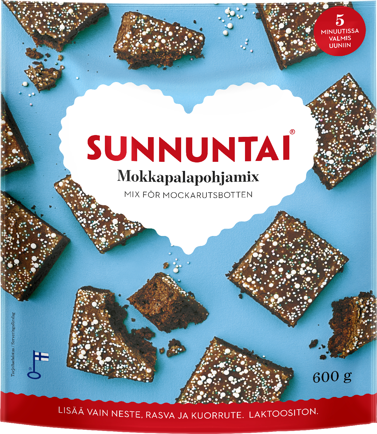 LaktoositonSunnuntai Mokkapalapohjamix on helppo ja nopea tapa leipoa joka perheen suosikkileivonnainen. Mokkapalapohjan valmistuksessa leivontamixiin lisätään vain öljy ja neste (valinnan mukaan esim. kahvi, maito tai appelsiinimehu), ja pohja on valmis paistettavaksi. Kuorrutteen ja koristeet voit lisätä oman makusi mukaan, ne eivät ole mukana jauhomixissä. Tuote on monikäyttöinen ja soveltuu myös muun muassa muffinsseihin. Jauhoseos on laktoositon.