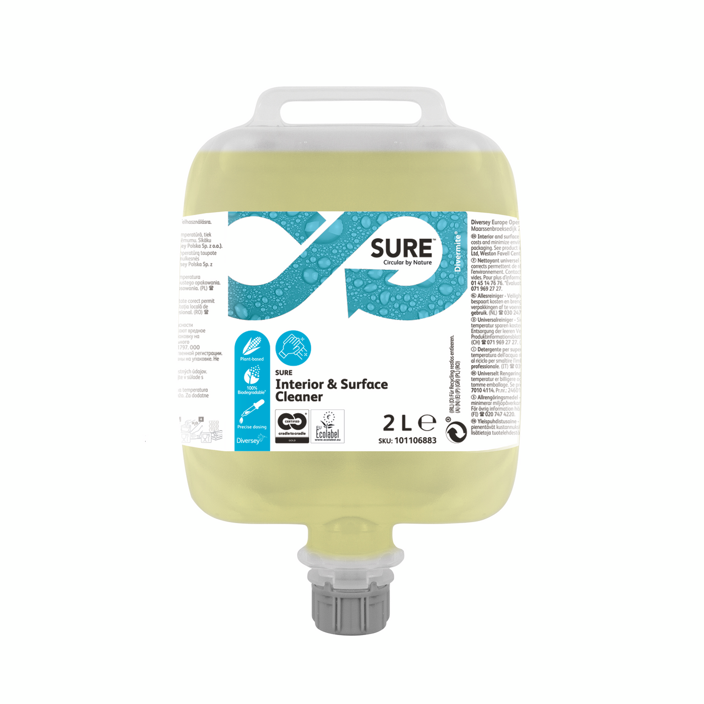 SURE Yleispuhdistusaine on osa ainutlaatuista kasvipohjaista, 100 % biohajoavaa ammattikäyttöön tarkoitettua tuotesarjaa. Tiivistetty SURE Yleispuhdistusaine sopii kaikkien vettä sietävien kovien pintojen puhdistamiseen (katto, seinät, lattiat, tasopinnat). Se on erinomainen myös keittiön erilaisten pintojen puhdistuksessa. SURE Yleispuhdistusainetta annostellaan tarkasti Diverseyn Divermite S -annostelijan avulla. Ainoastaan ammattikäyttöön.