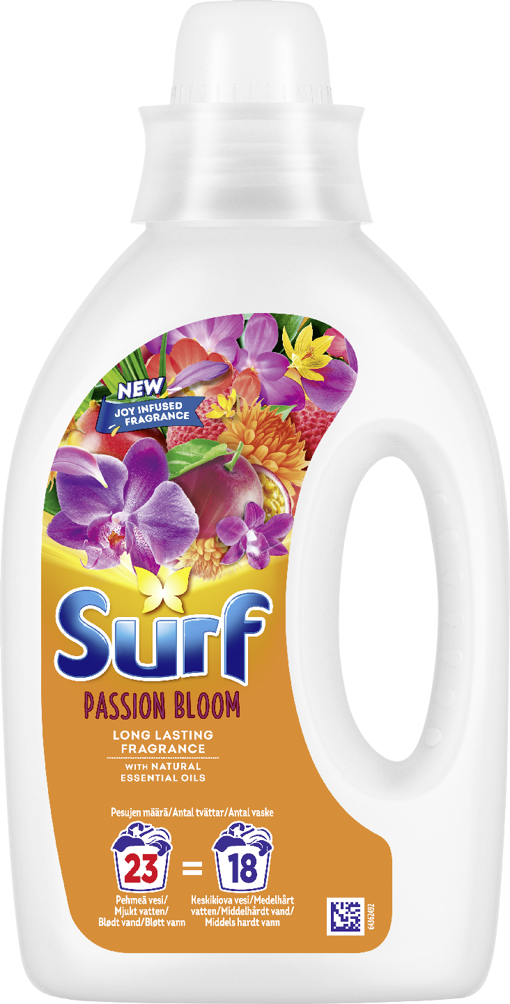 Surf Passion Bloom on pyykinpesuaine, joka tekee pyykistäsi loistavan puhdasta ja ihanan tuoksuista. Olemme kehittäneet jokaisen Surf-tuoksun huolella ja valinneet mukaan luonnon parhaat kukka- ja hedelmätuoksut. Surf-tuotteiden sisältämät eteeriset öljyt saavat pyykkisi tuoksumaan ihanalta pitkään. Pesuaine soveltuu sekä väri- että valkopesuun eli sekä valkopyykille että kirjopyykille.