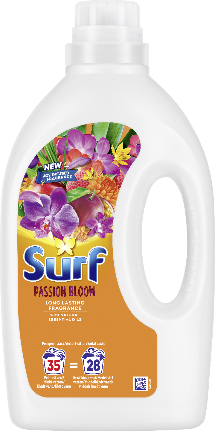 Surf-pyykinpesun jälkeen pyykkisi on paitsi puhdasta, se myös tuntuu hyvältä. Vaatteidesi eksoottisen hedelmäinen tuoksu hellii aistejasi ihastuttavan voimauttavalla tavalla. Surf Passion Bloom ei sisällä väriaineita, ja lisäksi se pesee tehokkaasti jo alhaisissa lämpötiloissa. Surf-pyykinpesunesteen pullo on tehty kierrätetystä muovista.