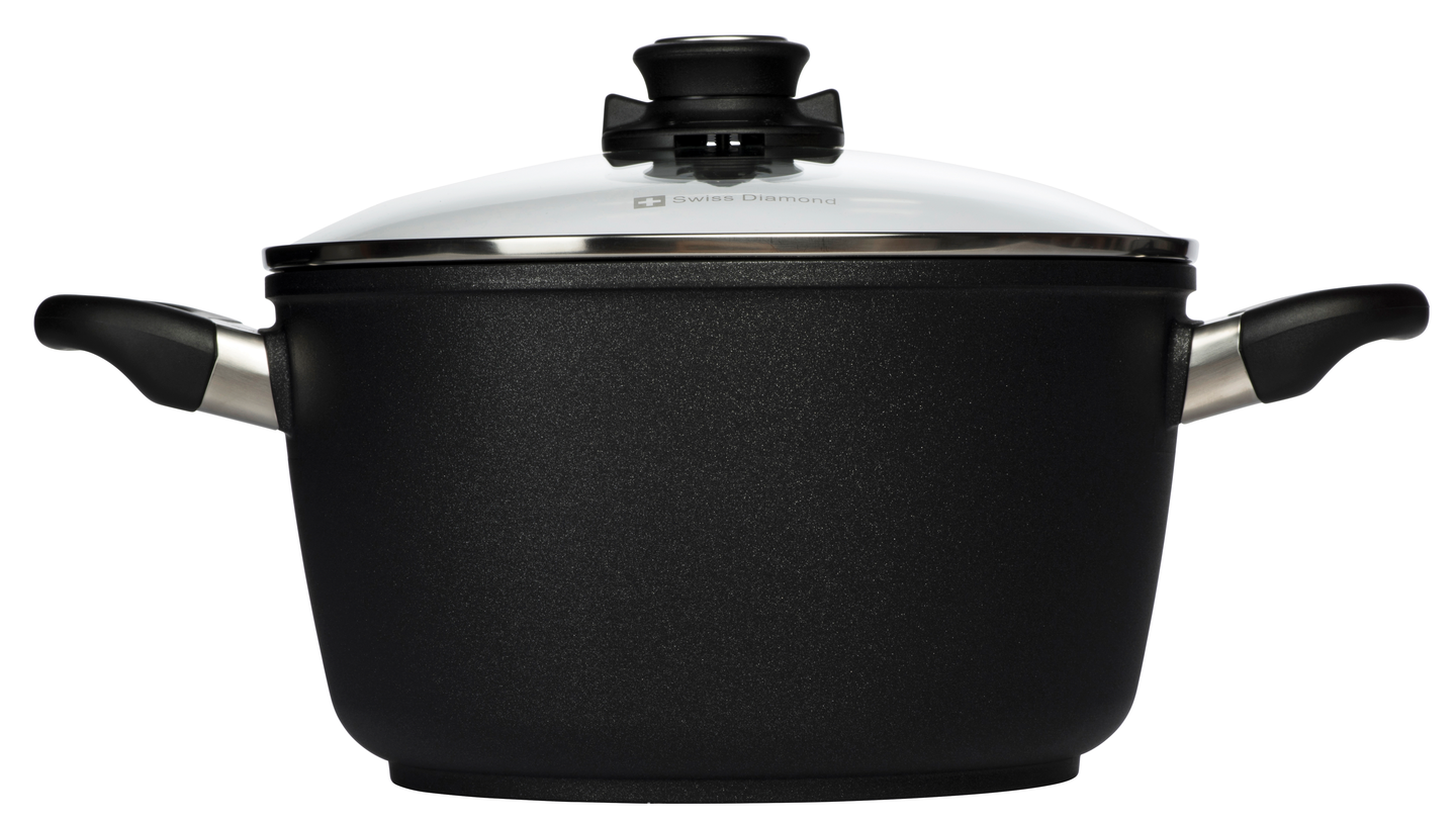 Swiss Diamond -pata 5,2 l on varustettu tasaisesti ja tehokkaasti lämpenevällä, paksulla valualumiinirungolla sekä erittäin kestävällä, lämpöä johtavalla kolmikerroksisella XD-timanttipinnoitteella. Timanttihiukkaset johtavat lämpöä tehokkaasti ja nopeasti. Valualumiinirunkoisessa padassa lämpö jakautuu tasaisesti myös padan laitoihin, mikä varmistaa ruoka-aineiden tasaisen kypsymisen. Padan paksu pohja varaa lämpöä tehokkaasti, joten se pysyy kuumana pitkään. Pata kestää uuninlämpöä 260 °C saakka, ja sen kahvat pysyvät viileänä liedellä käytettäessä. Padan halkaisija on 24 cm, ja reunan korkeus sisäpuolelta mitattuna 13,5 cm. Se on valmistettu Sveitsissä lähes 100-prosenttisesti kierrätetystä alumiinista. Suositellaan käsinpesua. Soveltuu myös induktioliedelle. Lasikansi on varustettu höyryaukolla.