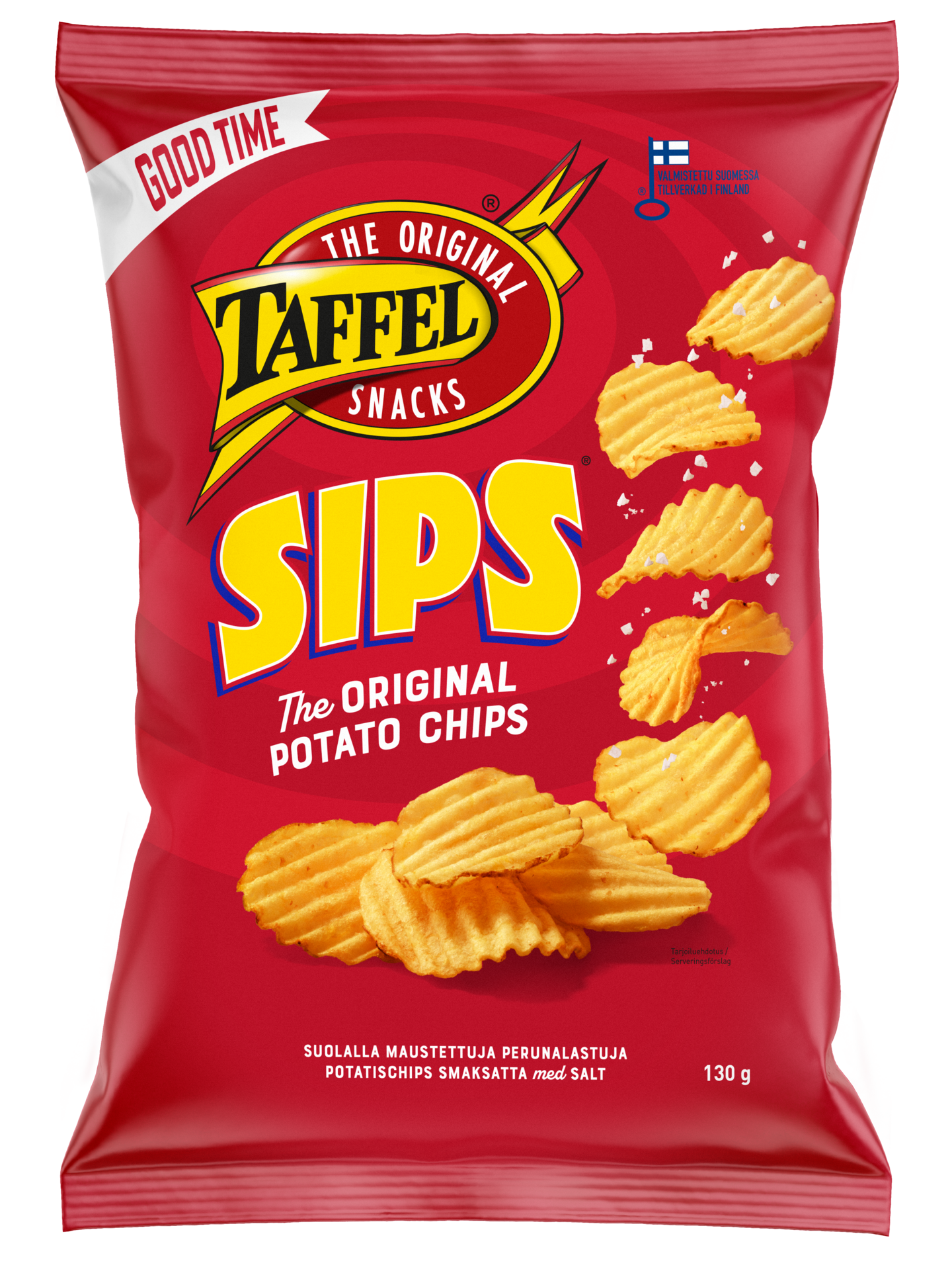VegaaninenPoimutettu unelma, Taffel SIPS valmistetaan vain parhaista perunoista, suolataan taidolla sekä paistetaan korkealaatuisessa kasviöljyseoksessa kullankeltaiseksi ja täydellisen rapeaksi. Hullunhyvä myös dippisipsinä.