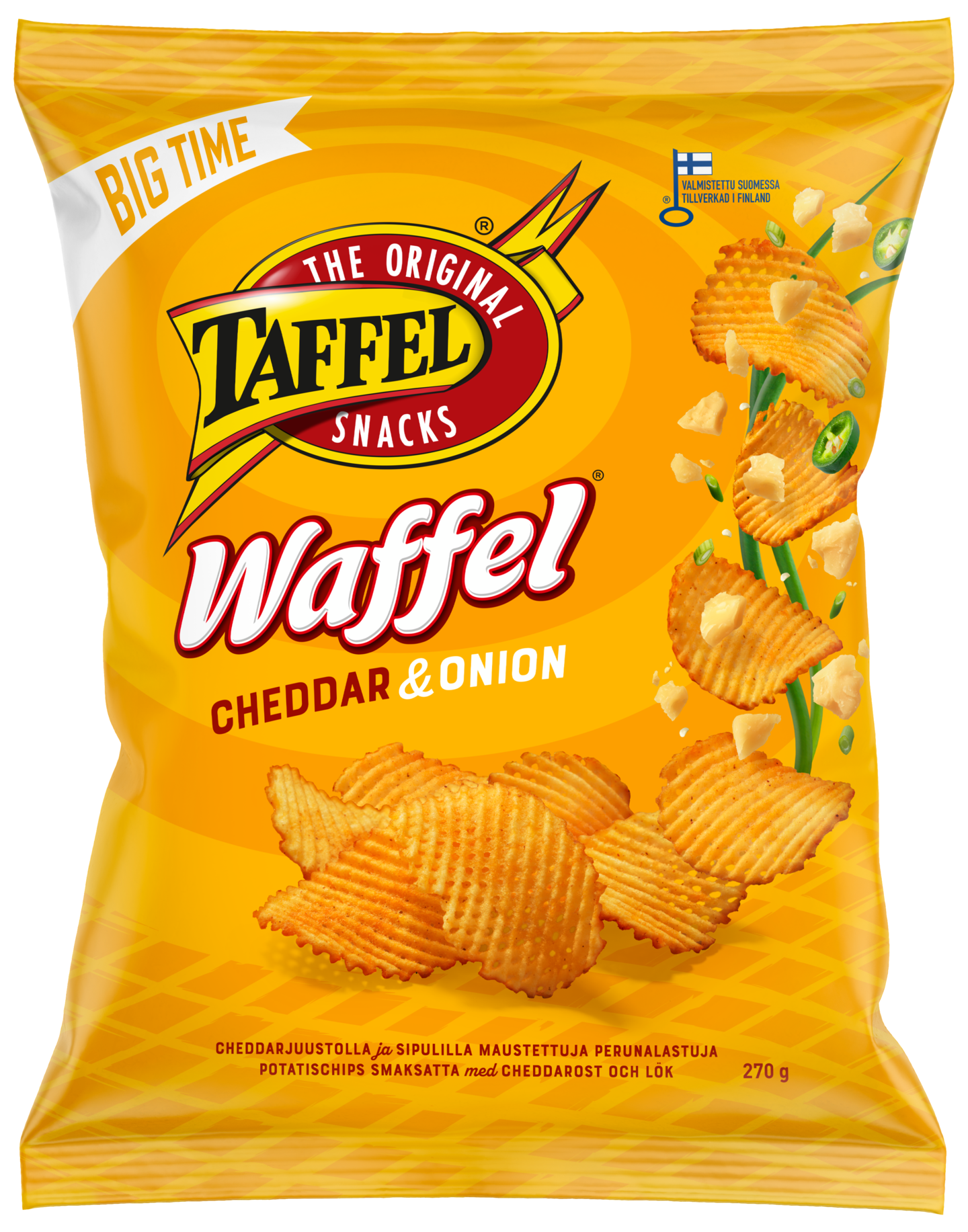 GluteenitonPerunasta jännästi leikattu Taffel Waffel Cheddar & Onion -sipsi on kuin rapeaa pitsiä, joka on maustettu aidolla cheddarjuustolla ja sipulilla.