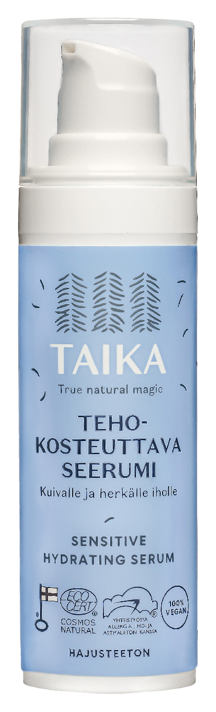 Taika Kosteuttava Kasvoseerumi tarjoaa intensiivistä ja pitkäkestoista kosteutusta kuivalle ja herkälle iholle. Sen kevyt, nopeasti imeytyvä koostumus sisältää ihoa hemmottelevia ja tehokkaasti kosteuttavaa ksylitolia ja glyserolia sekä hoitavaa kauraöljyä ja rypsiöljyä. Kasviperäiset keramidit vahvistavat ihon suojamuuria ja suojaavat ihoa ulkoisilta haittatekijöiltä. Tämä hajusteeton ja vegaaninen seerumi on täydellinen valinta osana päivittäistä ihonhoitorutiinia - täydentäen erityisesti Taika-kasvovoiteiden tehoa. Kehitetty yhteistyössä Allergia-, iho- ja astmaliiton kanssa. Ecocert Cosmos Natural -sertifioitu luonnonkosmetiikkatuote, valmistettu Suomessa.