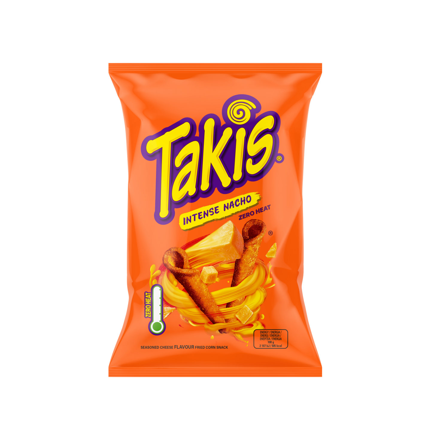 Takis Intense Nacho on suositun Takis perheen lempeä uusi jäsen. Tämä runsaan juustoinen maissisnack ei ole tulinen kuten sarjan muut variantit mutta ei silti häviä maun runsauden puolesta. Tämä herkku sopii niin arkeen kuin juhlaan. Dippaa suosiskki dippiisi tai kokeile salaatin joukossa tuomaan rapeutta ja makua.