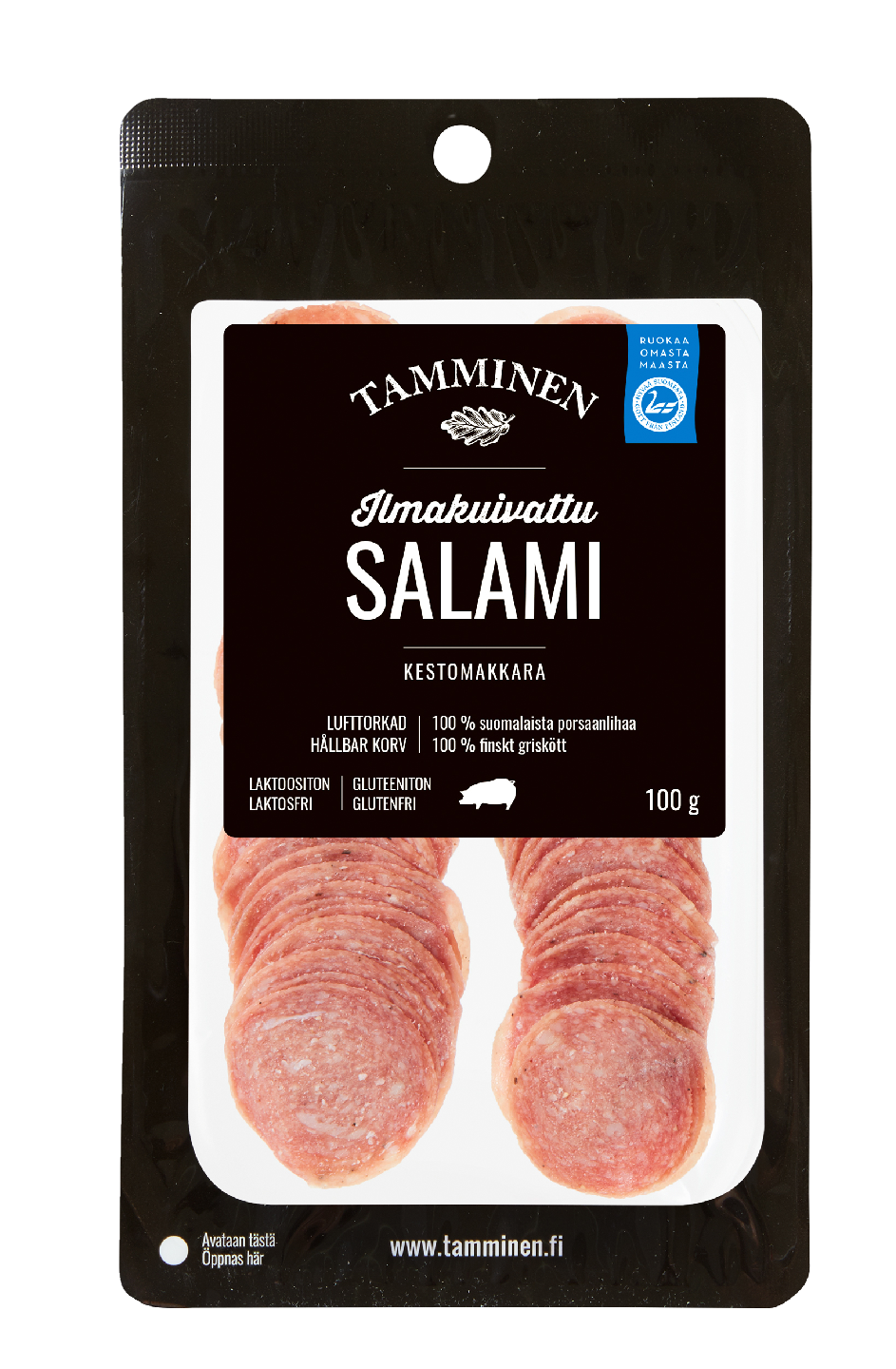 LaktoositonTamminen ilmakuivattu Salami valmistetaan 100 % suomalaisesta porsaanlihasta. Ainutlaatuisella menetelmällä, pitkään ilmakuivaamalla kypsytetty leikkele soveltuu esimerkiksi tapasten kera nautittavaksi tai lisukkeeksi salaatteihin, pitsoihin ja leivän päälle. 100 g:aan tuotetta on käytetty 146 g lihaa.