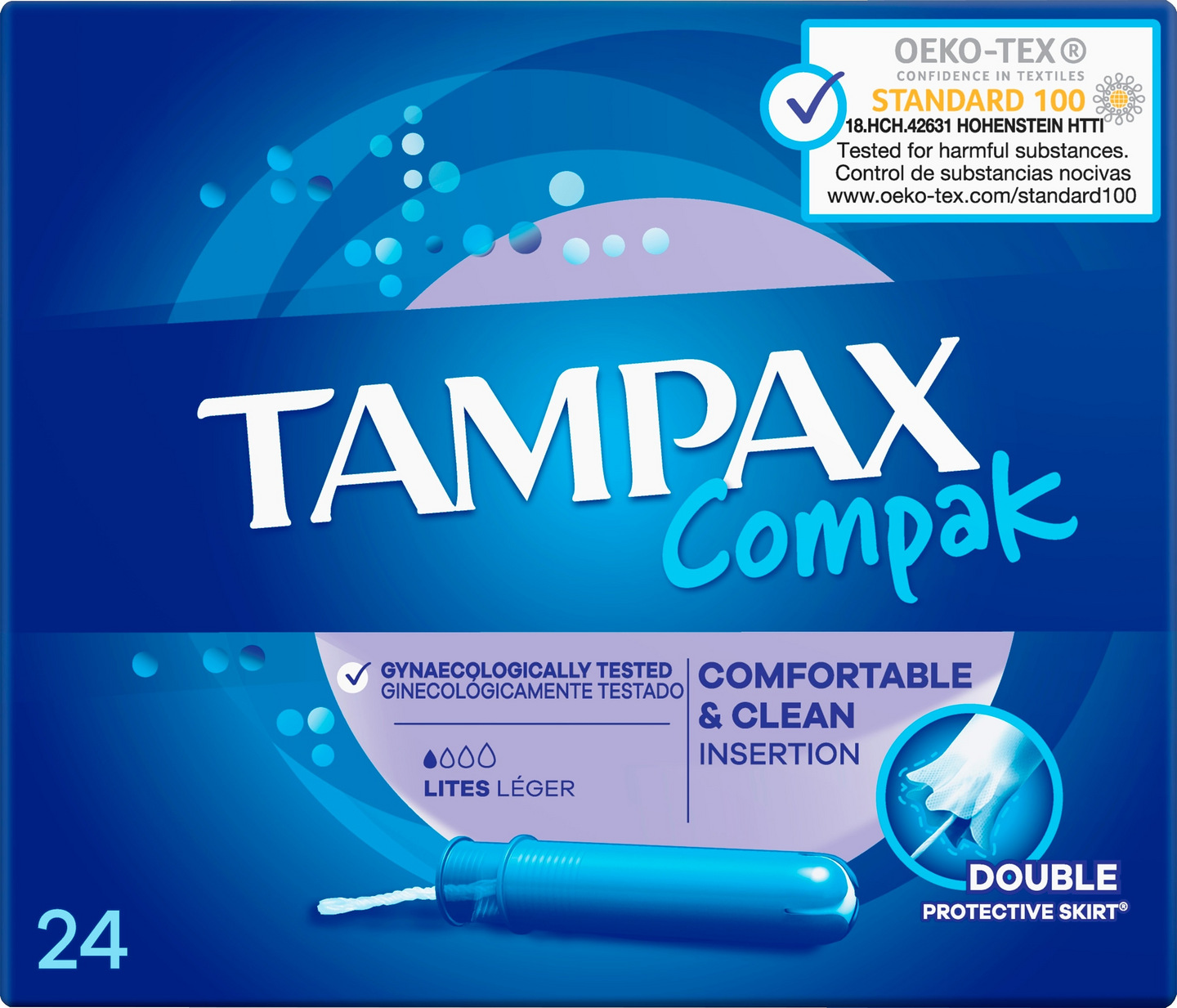 Tampax Compak Lites -tamponit tarjoavat suojaa ja huomaamattomuutta vähäiseen kuukautisvuotoon. Tampax Compak -tamponit tarjoavat kuukautissuojan kätevässä koossa. Ne ovat hajusteettomia. Tampax Compak -tamponeissa on kompakti muovinen asetin ja pyöristetty pää, joka tekee asettamisesta helppoa ja miellyttävää. Imukykyiset kanavat imevät nesteen suoraan tamponin ytimeen ja kaksinkertainen suojaava reuna estää ohivuodot, jotta voit tuntea olosi huolettomaksi kuukautisten aikana. Tampax Compak -tamponit ovat gynekologisesti testattuja. Ne on myös riippumattomasti testattu haitallisten aineiden varalta ja niillä on Öko-Tex Standard 100 -sertifikaatti. Luotettava vuotamaton suoja, jonka ansiosta voit tehdä mitä haluat. Tampax Compakin parhaat tamponit vähäiseen tai niukkaan kuukautisvuotoon. Kokeile Tampax Pearl Compak -tamponia – Tampaxin parasta mukavuutta ja suojaa.