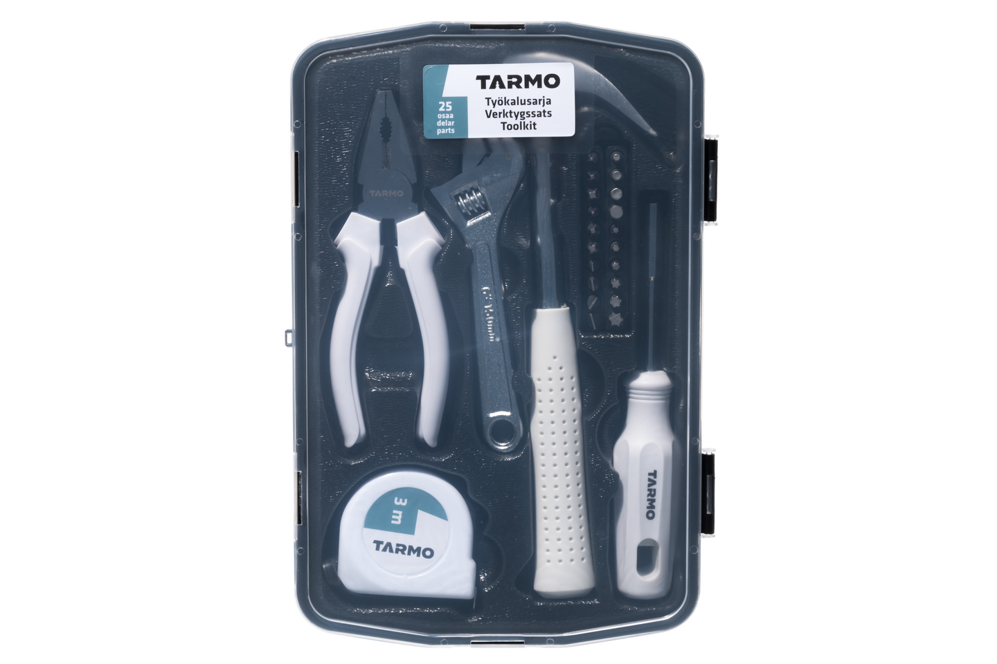 Screwdriver, 20 screws, 8 oz hammer, 150 mm wrench, 3 m measure tape, 160 mm line clamps.