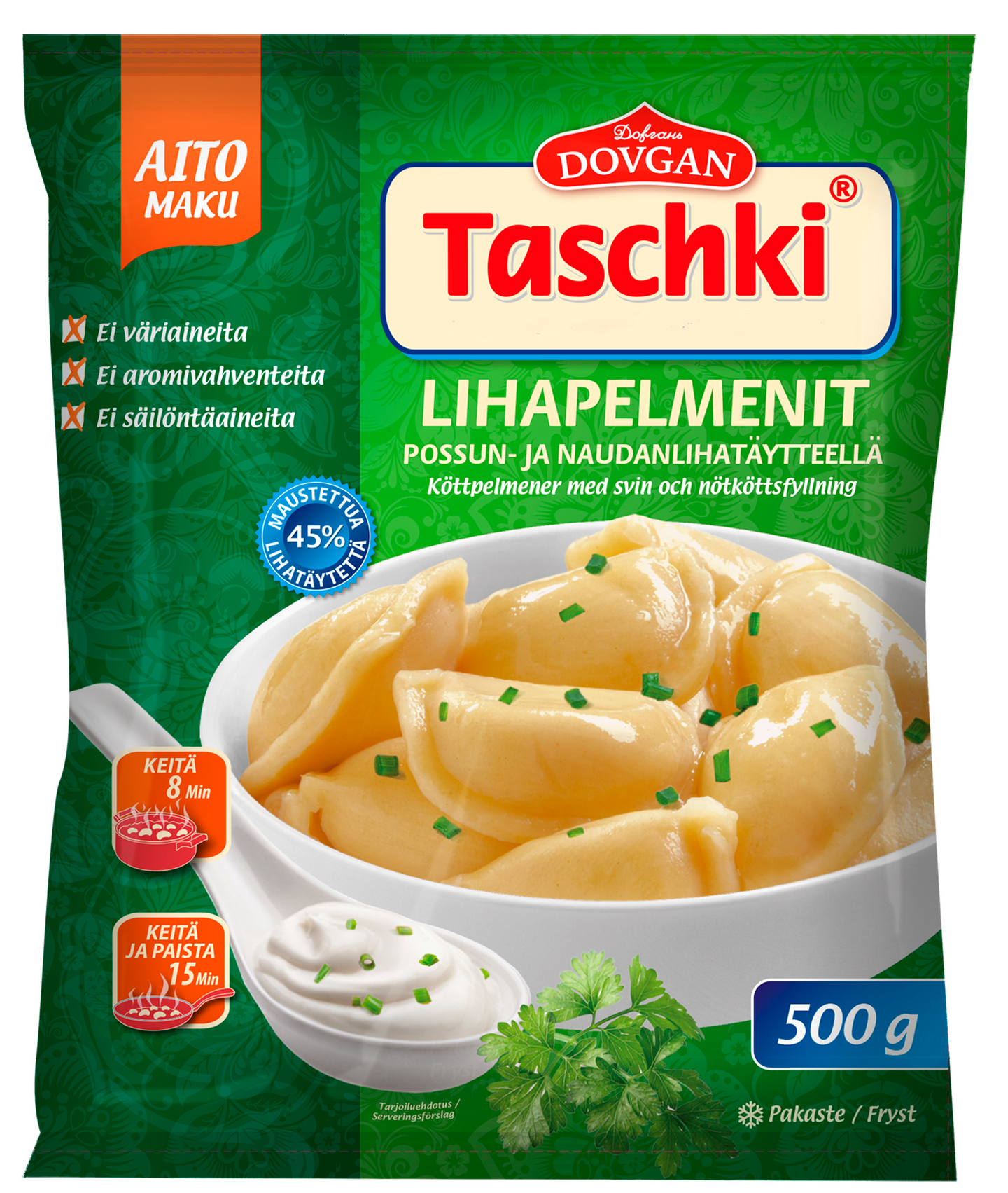 Taschki-pelmenit ovat täysin lisäaineettomia eivätkä sisällä keinotekoisia aromeja, aromivahventeita, väri- tai säilöntäaineita. Kaikki Taschki-pelmenit on valmistettu korkealaatuisista raaka-aineista.