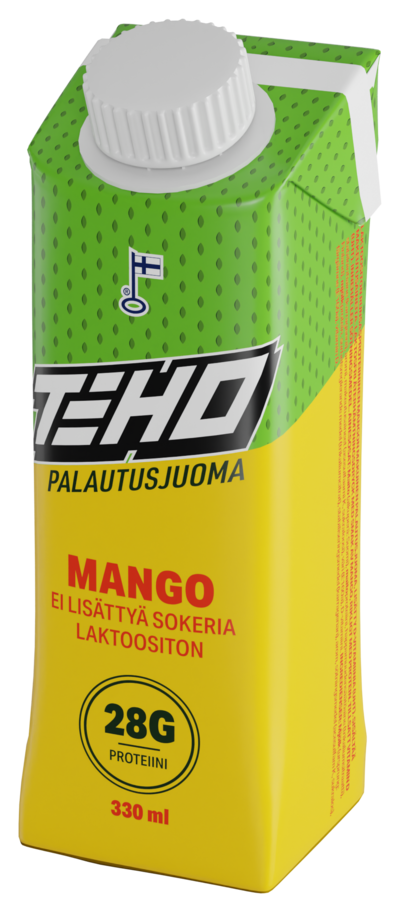 LaktoositonTEHO palautusjuomat on valmistettu suomalaiseen laktoosittomaan lähimaitopohjaan. Tuotteet on jaettu käyttöyhteyden perusteella kahteen konseptiin: voima- ja kestävyysharjoitteluun. TEHO Mango palautusjuoma on suunniteltu tukemaan palautumista voimaharjoittelusta tai toimimaan proteiinipitoisena välipalana. Raikkaan mangon maku tekee palautumisesta nautinnollista ja vastaavaa makua ei markkinoilta löydy! Juoma ei sisällä lisättyä sokeria, vaan ainoastaan maidon luonnollisen sokerimäärän. Yksi pakkaus sisältää runsaasti proteiinia, eli 28 g ja vain 5,0 g/dl hiilihydraatteja.
