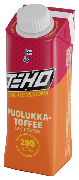 LaktoositonTEHO palautusjuomat tarjoavat laadukasta ja tehokasta palautumista suomalaisesta laktoosittomasta lähimaidosta. Tuotteet on jaettu käyttöyhteyden perusteella kahteen konseptiin: voimaharjoitteluun ja kestävyysharjoitteluun, jotta palautuminen olisi optimoitua eri treenitarpeisiin. Runsasproteiiniset ja reilun kokoiset 330 ml pakkaukset vastaavat aktiivisten kuluttajien tarpeisiin. TEHO Puolukka-Toffee Palautusjuoma on täysin ainutlaatuinen makuyhdistelmä markkinoilla! Puolukan raikkaus ja toffeen pehmeä makeus tekevät tästä erottuvan palautusjuoman voimaharjoittelusta palautumiseen. Sisältää 28 g proteiinia ja 8,7 g/dl hiilihydraatteja, edistäen lihasten palautumista ja energiavarastojen täydentymistä.
