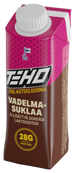 LaktoositonTEHO palautusjuomat on valmistettu suomalaiseen laktoosittomaan lähimaitopohjaan. Tuotteet on jaettu käyttöyhteyden perusteella kahteen konseptiin: voima- ja kestävyysharjoitteluun. TEHO Vadelma-suklaa palautusjuoma on tarkoitettu voimaharjoittelusta palautumiseen tai välipalaksi. TEHO Vadelma-suklaa ei sisällä lisättyä sokeria, ainoastaan maidossa luonnollisesti olevan määrän. Tuote on runsasproteiininen, yksi pakkaus sisältää 28 g proteiinia ja vain 4,9 g/dl hiilihydraatteja. Tuote on makeutettu makeutusaineilla, mutta ilman aspartaamia.