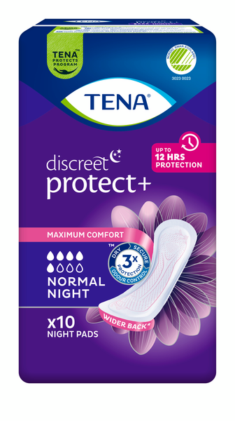 TENA Discreet Normal Night -inkontinenssisuojat naisille ovat riittävän pitkiä ja takaosastaan leveitä suojaten näin erityisen hyvin öiseen aikaan makuuasennossa kohtalaiselta tai vaikealta inkontinenssilta. Äärimmäinen imukyky juuri oikeissa paikoissa takaa, että kosteus imeytyy nopeasti pois iholta. Olo pysyy kuivana ja mikrohelmet ehkäisevät epämiellyttävien hajujen muodostumista. Suoja myötäilee kehoa pehmeiden, joustavien reunojensa ansiosta ja on näin erityisen mukavan tuntuinen suojaten ohivuodoilta ja hajuilta - ja yö sujuu rauhallisesti nukkuen.