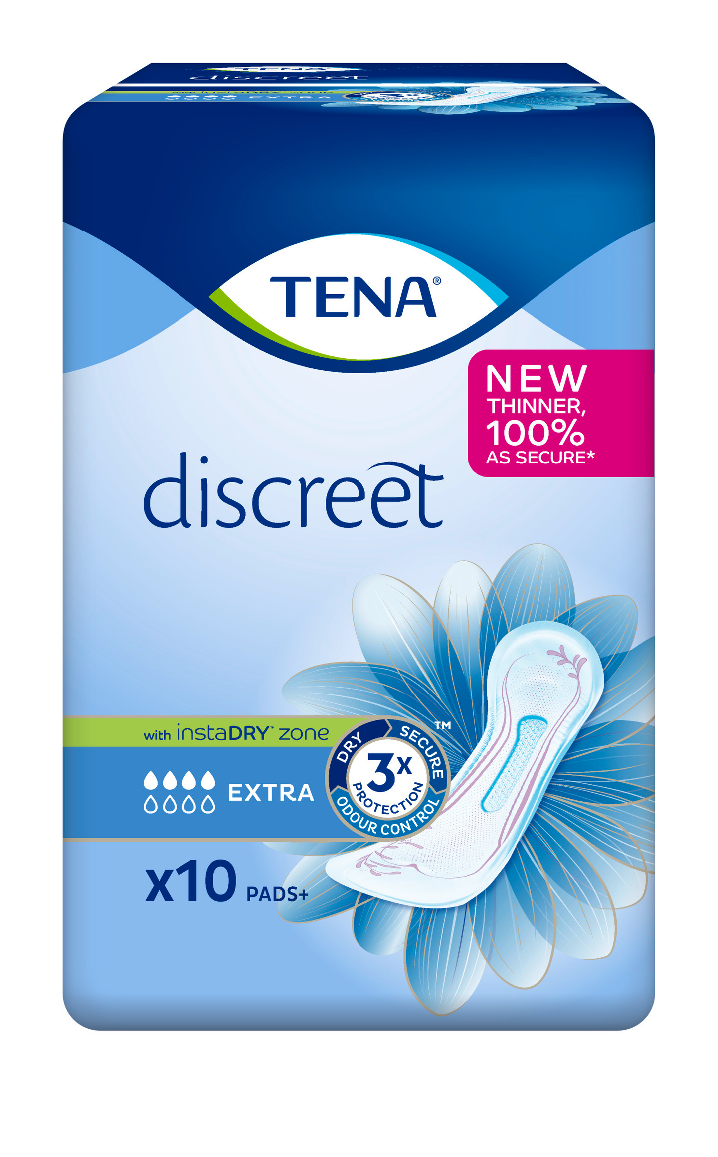 TENA Discreet Extra vartalonmukaisella DryZone-ominaisuudella antaa KOLMITEHOISEN SUOJAN ohivuotoja, hajua ja kosteaa tunnetta vastaan. TENA Discreet Extra on aivan yhtä huomaamaton kuin kuukautissuoja, mutta paljon imukykyisempi. Tunnet olosi välittömästi kuivaksi ja varmaksi kaikissa tilanteissa. Vartalonmukainen Body Shaped DryZone tarjoaa tehokasta ja huomaamatonta suojaa- Fresh Odour Control -ominaisuus takaa itsevarman olon. Kolmitehoinen suoja – kuiva tunne, varma olo ja Odour Control -ominaisuus hajuja vastaan.