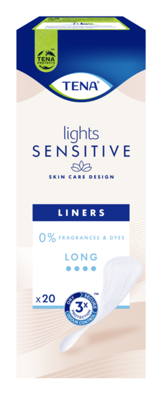 TENA lights Sensitive pikkuhousunsuojat on suunniteltu erityisesti pienille odottamattomille pisaroille. TENA lights Sensitive Long pikkuhousunsuoja on hieman imukykyisempi ja pidempi pikkuhousunsuoja. Se on yhtä ohut (3,5 mm) ja huomaamaton kuin tavalliset pikkuhousunsuojat, mutta kaksi kertaa imukykyisempi ja vähentää mahdollisia hajuja. FeelFresh™-teknologia lukitsee kosteuden nopeasti sisäänsä ja säilyttää olon kuivana ja raikkaana. TENA lights Sensitive -pikkuhousunsuojat myötäilevät kehoasi ja ovat niin silkinpehmeitä, että tuskin huomaat niitä. Olosi on kuiva ja raikas - joka päivä.