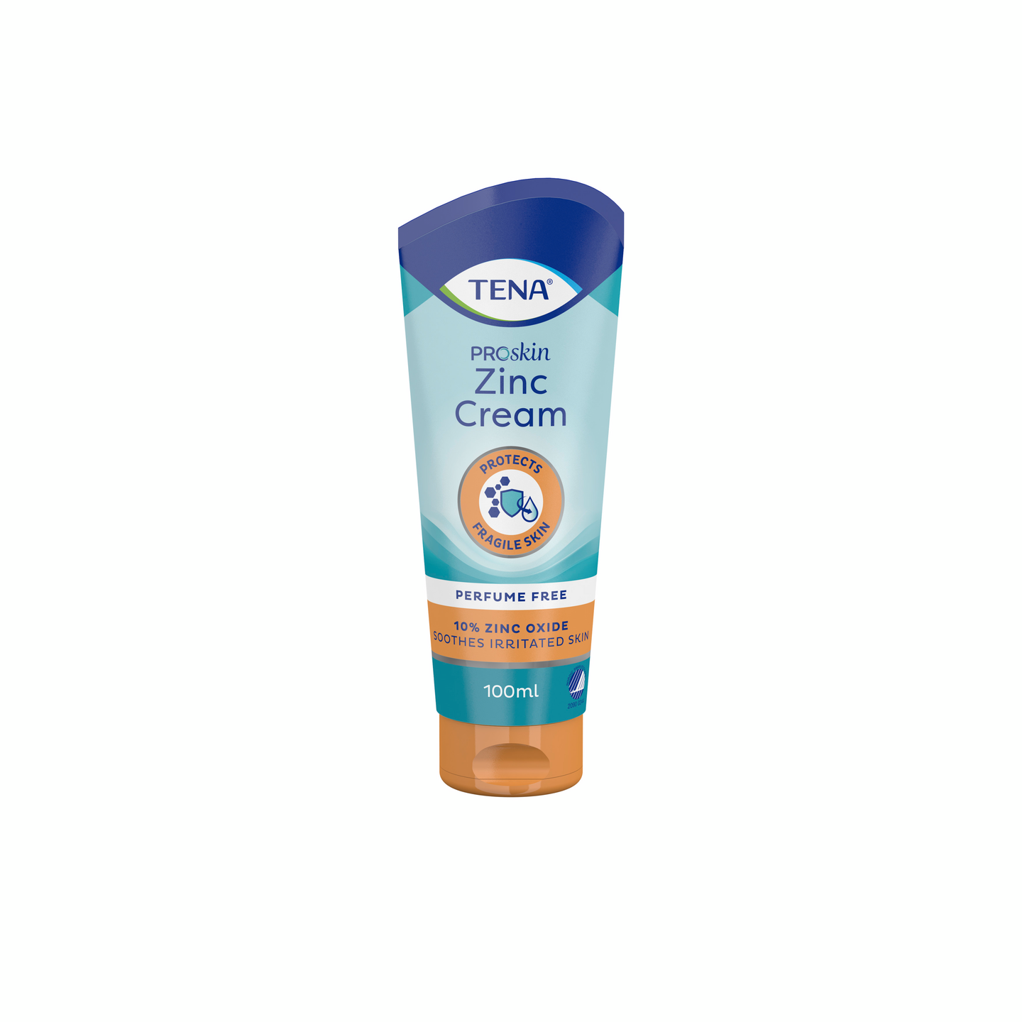 TENA ProSkin Zinc Cream Sinkkivoide on rauhoittava ja suojaava voide inkontinenssihoidon yhteydessä. Se sisältää sinkkioksidia (10 %), rypsiöljyä ja E-vitamiinia. Tämä erittäin suojaava koostumus on ihanteellinen ärtyneelle, herkälle ja ikääntyvälle iholle.