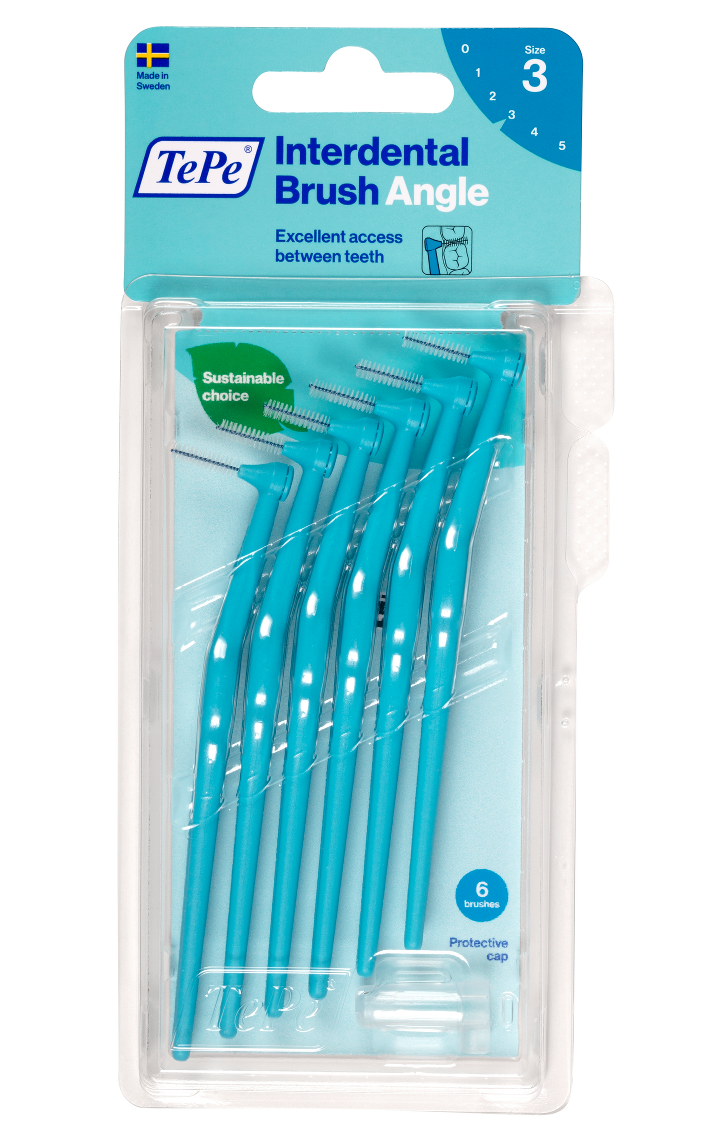 TePe Angle on suunniteltu hallittuun ja helppoon hammasvälien puhdistukseen. Harjan pää on pieni ja taivutettu jotta se ulottuu helpommin takahampaiden väliin, sekä suulaen että kielen puolelta. Pitkällä, litteällä varrella saa hyvän ergonomisen otteen. TePe Angle on hyvä valinta, jos käsimotoriikka on heikentynyt. TePe Angle löytyy kuudessa värikoodatussa koossa, jotta se sopii kaikkiin hammasväleihin. Värikoodit ovat samat kuin Original-sarjassa. Kaikki koot on varustettu muovipäällysteisellä metallilangalla, joten hammasvälien puhdistaminen on hellävaraista ja turvallista. Etuja: Pieni taivutettu pää optimaaliseen ulottuvuuteen, Pitkä, litteä varsi tekee harjasta helpon käsitellä, Muovipäällysteinen metallilanka hellävaraiseen puhdistukseen, Kuusi värikoodattua kokoa. Korvaamalla fossiiliraaka-aineen fossiilittomilla mäntyöljyillä olemme pienentäneet hammasväliharjan hiilijalanjälkeä 80 prosenttia – tuotteen laadusta, tehosta tai muotoilusta tinkimättä. Valmistettu Ruotsissa.