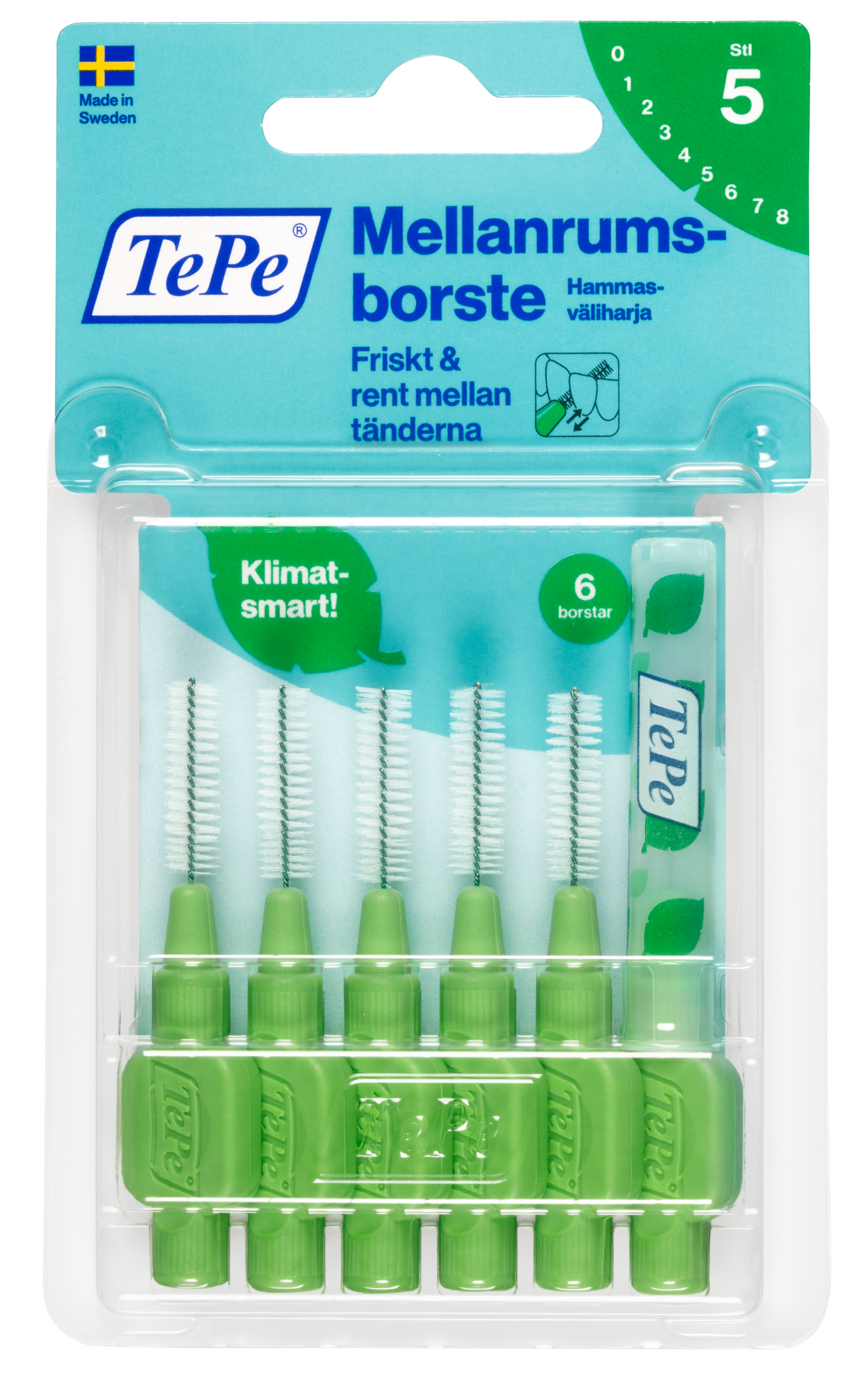 TePe-hammasväliharja on suunniteltu hammasvälien puhdistamiseen, joihin tavallisen hammasharjan harjakset eivät ulotu. Väliharjoja on suositeltavaa käyttää päivittäin, niiden käyttö edesauttaa ikenien ja hampaiden terveyttä sekä helpottaa hammasvälien puhdistusta. TePe hammasväliharjat on kehitetty yhteistyössä hammaslääketieteen ammattilaisten kanssa. Päivittäin käytettynä väliharjat poistavat jopa 40 prosenttia enemmän plakkia. Väliharja poistaa plakkia tehokkaammin hammasväleistä, kuin pelkkä hammasharja. Tehokas plakinpoisto ehkäisee ientulehduksia, hampaiden reikiintymistä ja pahanhajuista hengitystä. Korvaamalla fossiiliraaka-aineen fossiilittomilla mäntyöljyillä olemme pienentäneet hammasväliharjan hiilijalanjälkeä 80 prosenttia – tuotteen laadusta, tehosta tai muotoilusta tinkimättä. Valmistettu Ruotsissa. * Tehokkain tapa plakin poistamiseen hammasväleistä * Muovipinnoitetun langan ansiosta omien hampaiden ja esim. implanttien välien puhdistus onnistuu turvallisesti ja hellävaraisesti * Joustava kaula parantaa kestävyyttä ja käyttämahdollisuuksia.