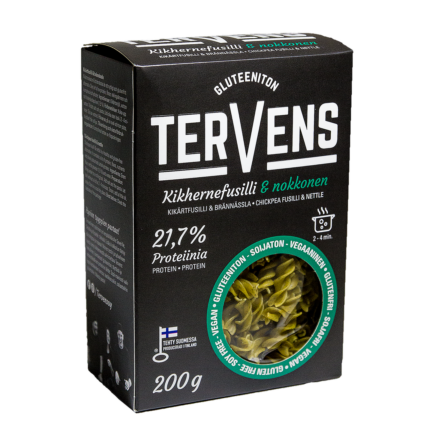 VegaaninenTervens kikhernefusilli & nokkonen on erittäin ravinteikas, luontaisesti gluteeniton ja vegaaninen vaihtoehto. Pasta, joka sisältää kuitua enemmän kuin perinteinen ruisleipä, pitää nälkää loitolla pitkään korkean proteiinipitoisuuden ja hitaiden hiilihydraattien a nsiosta. Ja hei, valmistukseen on käytetty vain kikhernejauhoa, vettä ja nokkosjauhetta, takuulla puhdasta! Fusilli sopii erityisen hyvin keittoihin, kylmäsalaatteihin ja kastikkeisiin.