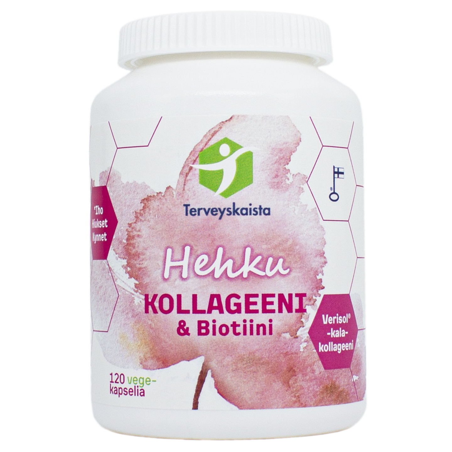 Markkinoiden vahvin kauneuskapseli Hehku Kollageeni & Biotiini sisältää laadukasta hydrolysoitua Verisol® F -kalakollageenia bioaktiivisessa peptidimuodossa. Se edistää kehon normaalia kollageenituotantoa ja vahvistaa ihon, kynsien ja hiusten hyvinvointia tehokkaalla aktiiviaineiden yhdistelmällään.