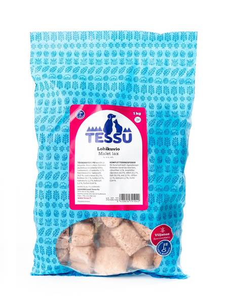Raakapakaste jauhetusta lohesta, uudelleensuljettavassa pussissa. Näppärän kokoinen lohikuvio (n. 30 g/ yksittäinen kuvio) sisältää hienoksi jauhettua lohta ruotoineen. Lohen omega-3-rasvahapot (EPA, DHA) tukevat koirasi monipuolista ravitsemusta osana ravintoa. Lohi on myös monen koiran herkku!