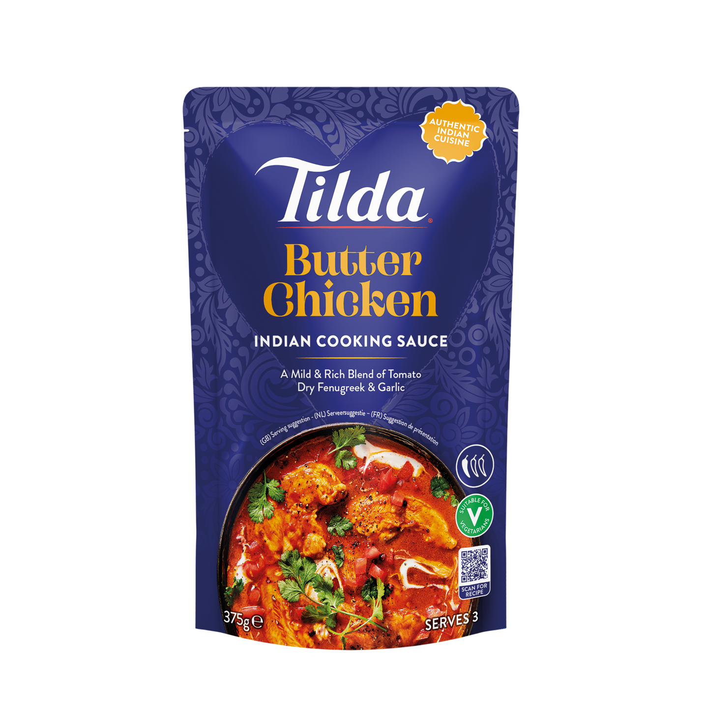 Tilda Butter chicken on mieto ja täyteläinen valmiskastike, jonka makumaailma on ihana sekoitus tomaattia, kuivattua sarviapilaa ja valkosipulia. Butter Chicken on intialaisen keittiön yksi klassikkokastikkeista ja ruoka sai alkunsa alun perin vanhan Delhin ikonisissa ravintoloissa, joissa kana grillattiin tandooriuunissa ja tarjoiltiin miedossa, kermaisessa tomaatti- ja voikastikkeessa. Tilda kastike sopii kasvisruokavalioon, joten jos haluat kastikkeeseen lisää kermaisuutta, voit lisätä siihen nokareen voita ja n. 30 ml kermaa. Voit myös täydentää ateriaa rikastamalla kastiketta tuoreella tomaatilla ja kanalla tai paneer-juustolla. Tarjoile valmis ruoka basmatiriisin ja mangochutneyn kanssa. Avaamaton pakkaus säilyy huoneenlämmössä ja avattuna kastike täytyy säilyttää jääkaapissa ja käyttää 3 vuorokauden kuluessa. Kastike on valmis lämmitettäväksi, pussi ei sovellu mikroon.
