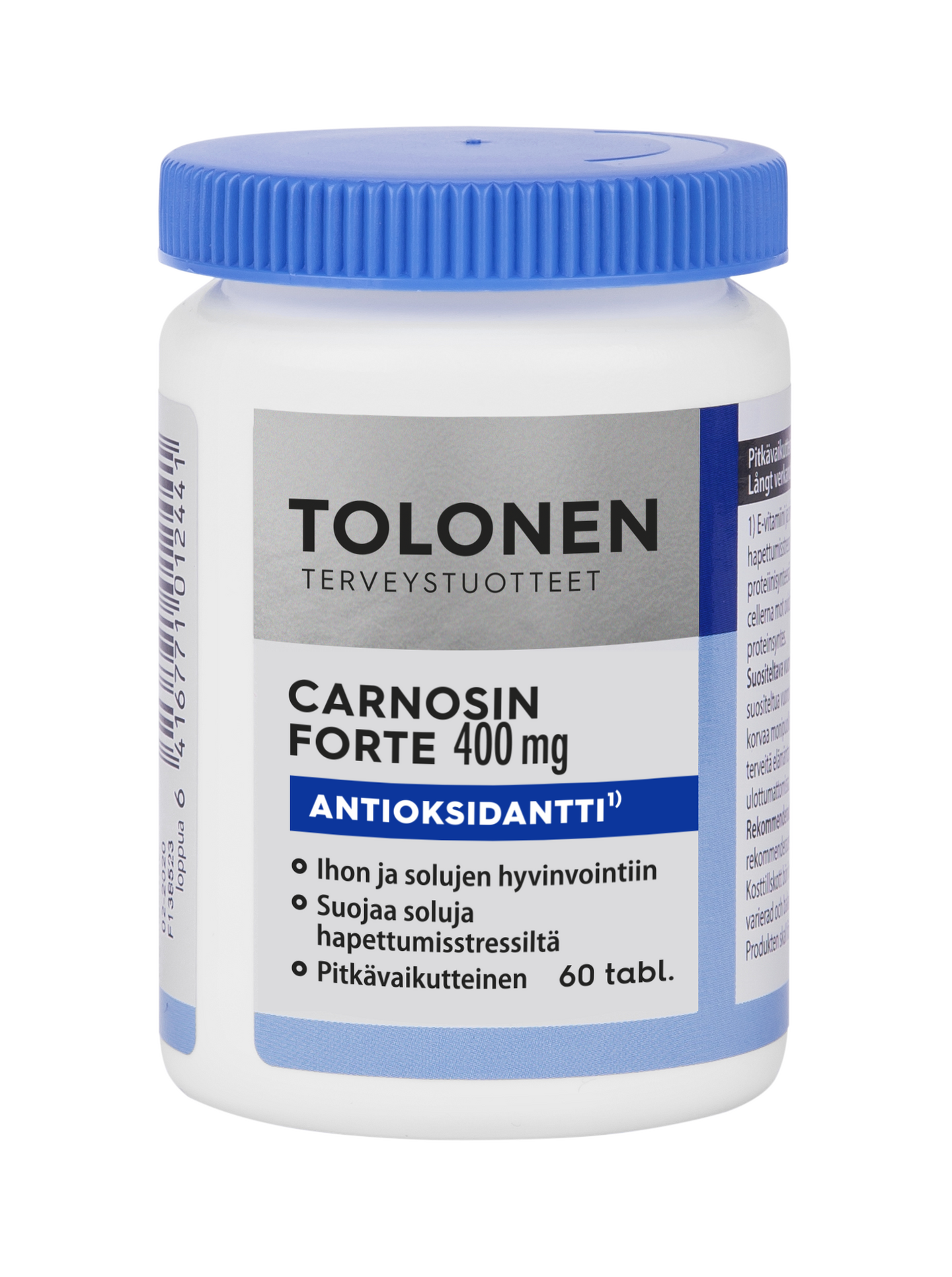 Alkuperäinen karnosiinitabletti! Tolonen Carnosin Forte 400 mg -tableteista karnosiini vapautuu hitaasti, vasta ohutsuolessa, jossa se imeytyy. Valmiste sisältää karnosiinin lisäksi E-vitamiinia ja sinkkiä. E-vitamiini edistää solujen suojaamista hapettumisstressiltä. Sinkki edistäää normaalia proteiinisynteesiä. Yksi tabletti sisältää 400 mg L-karnosiinia, 10 mg E-vitamiinia ja 5 mg sinkkiä. Suositeltava vuorokausiannos 1-2 tablettia. Ravintolisä ei korvaa monipuolista ja tasapainoista ruokavaliota eikä terveitä elämäntapoja. Kehitetty Suomessa! Lajitteluohje: Muovijäte.