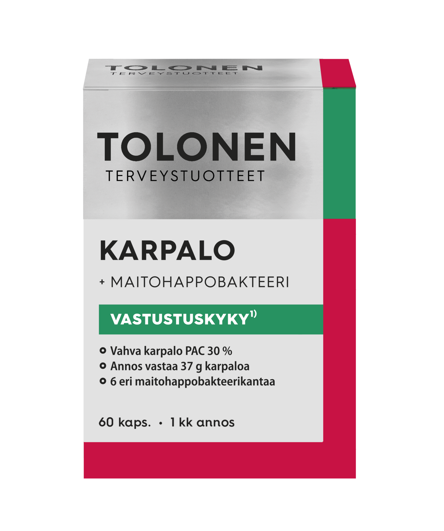 Vastustuskykyä naisille ja miehille. Tolonen Karpalo + maitohappobakteeri sisältää vahvan annoksen standardoitua amerikankarpalouutetta (Vaccinium macrocarpon), jossa 30 % protoantosyanideja (PAC). Päiväannos 2 kapselia vastaa 37 g tuoretta karpaloa sekä sisältää kuutta eri maitohappobakteerikantaa ja yhteensä 1 mrd elävää maitohappobakteeria. Kannat ovat: Bifidobacterium bifidum, Bifidobacterium longum, Lactobacillus acidophilus, Lactobacillus casei, Lactobacillus gasseri ja Lactobacillus rhamnosus. Tuote sisältää myös C-vitamiinia ja sinkkiä, jotka edistävät immuunijärjestelmän normaalia toimintaa. Tuote sopii jatkuvaan tai tarpeen mukaiseen käyttöön ja se sopii myös raskaana oleville ja imettäville. Ei suositella henkilöille, joilla on varfariinilääkitys. Ravintolisä ei korvaa monipuolista ja tasapainoista ruokavaliota eikä terveitä elämäntapoja. Suomessa kehitetty! Lajitteluohje: Ulkopakkaus pahviin, läpipainopakkaus sekajätteeseen.