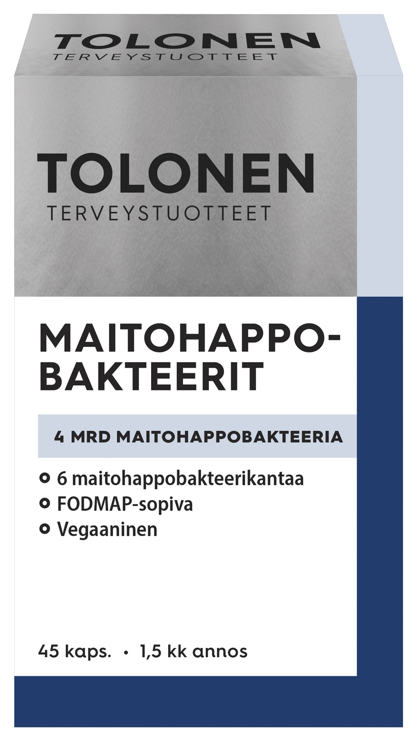 Tolonen Maitohappobakteerit 4 mrd, sisältää nimensä mukaisesti 4 miljardia elävää maitohappobakteeria yhdessä kapselissa. Se sisältää myös 6 tutkittua maitohappobakteerikantaa: Lactobacillus casei, Lactobacillus rhamnosus, Bifidobacterium l longum, Lactobacillus acidophilus, Bifidobacterium bifidum, Lactobacillus gasseri. Tuote sopii monille. Se ei sisällä FODMAP-ruokavalion kannalta haitallisia ainesosia, eikä laktoosia, gluteenia, soijaa, hiivaa tai sokeria. Lisäksi tuote on vegaaninen. Tuotteen koostumuksessa on kiinnitetty huomiota mahdollisimman lyhyeen ainesosalistaan. Siksi se sisältää vain kolme ainesosaa maitohappobakteerien lisäksi. Jos et halua niellä kapselia, voit avata sen ja sekoittaa sisällön ruoan/juoman sekaan. 1 kapseli päivässä, pakkauksessa 45 kapselia. Ravintolisä ei korvaa monipuolista ja tasapainoista ruokavaliota eikä terveitä elämäntapoja. Suomessa kehitetty! Pakkauksen lajitteluohje: Ulkopakkaus pahviin, läpipainopakkaus sekajätteeseen.