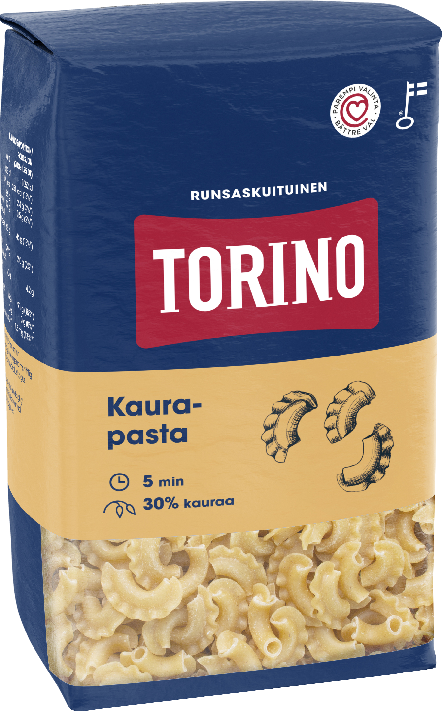 VegaaninenTorino Kaura -pasta sopii kaikkiin pastaruokiin. Suosittelemme sitä erityisesti lisäkkeeksi, salaatteihin ja laatikkoruokiin. Torino Kaura -pasta sisältää runsaasti kuitua ja reilusti kauraa, joka antaa pastalle miellyttävän täyteläisen maun. Valmistettu hiilineutraalilla energialla Raisiossa.