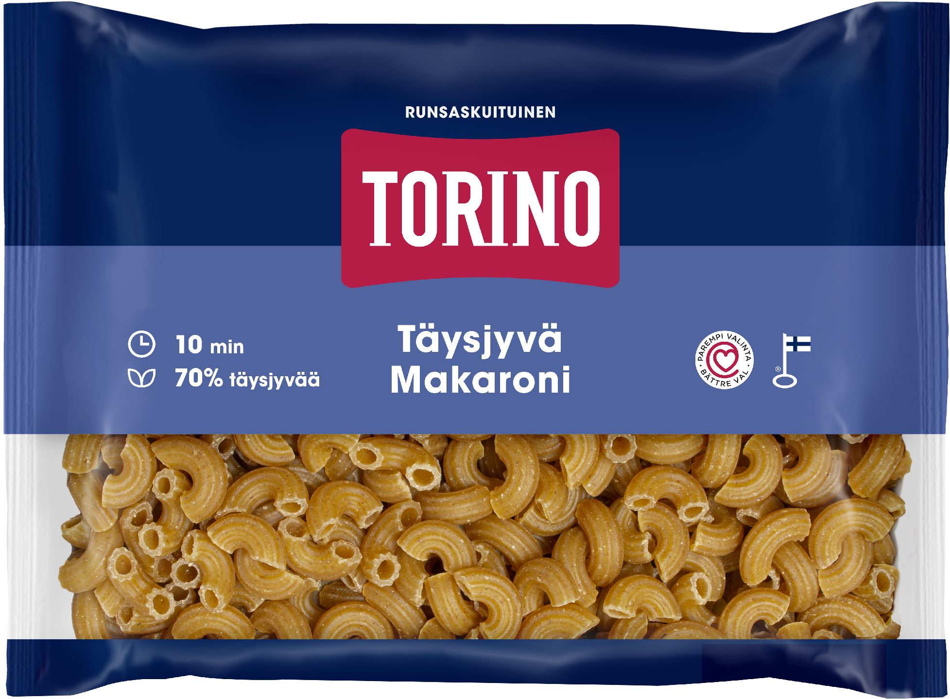 VegaaninenRunsaskuituinen Torino Täysjyvämakaroni on maistuva valinta kaikenlaisiin makaroniruokiin. Suosittelemme täysjyvämakaronia erityisesti laatikko- ja pataruokiin. Täysjyvävilja sisältää kaikki jyvän ravintorikkaat osat ja se antaa makaronille täyteläisen viljaisen maun. Valmistettu hiilineutraalilla energialla Raisiossa.