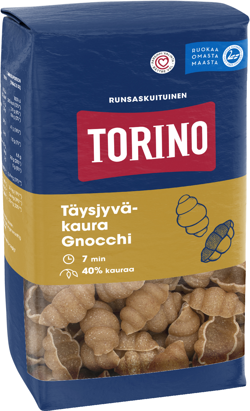 Torino Täysjyväkaura Gnocchi on kotimainen ja terveellinen vaihtoehto pastanystäville. Tämä runsaskuituinen pasta sisältää kauraa peräti 40% ja sopii erityisesti erilaisiin laatikkoruokiin sekä kastikkeiden kanssa. Valmistettu hiilineutraalilla energialla Raisiossa.