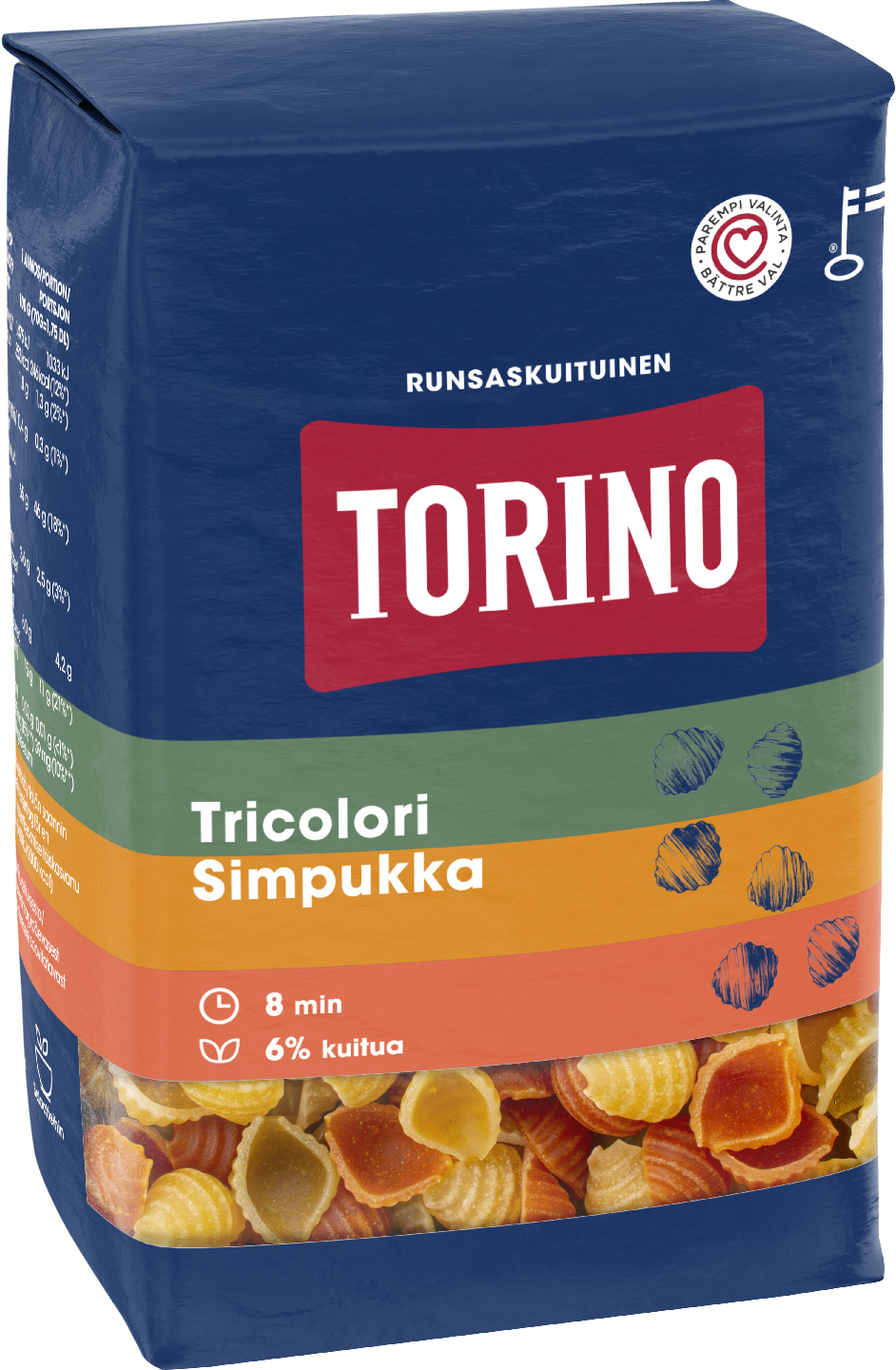 Runsakuituinen Torino Tricolori Simpukka -pasta sopii kaikenlaisiin pastaruokiin. Veikeä kolmivärinen simpukkapasta tuo väriä arkisempiinkin ruokiin. Punaisten simpukoiden valmistukseen on käytetty tomaattijauhetta ja vihreiden valmistukseen pinaattijauhetta. Tomaatti ja pinaatti antavat pastalle värin lisäksi myös herkullisen maun. Suosittelemme Torino Tricoloria erityisesti salaatteihin ja keittoihin. Valmistettu hiilineutraalilla energialla Raisiossa.