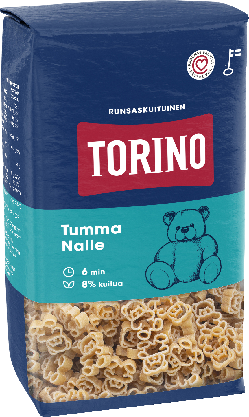 VegaaninenTorino Tumma Nallepasta on nimensä mukaisesti nallen muotoista pastaa, mikä tekee ruokailuhetkestä entistä hauskemman. Tumma Nalle on runsaskuituisempaa ja maukkaampaa kuin vaalea pasta. Suosittelemme Tumma Nalle pastaa kaikenlaisiin pastaruokiin, mutta erityisesti lisäkkeeksi ja keittoihin. Valmistettu hiilineutraalilla energialla Raisiossa.